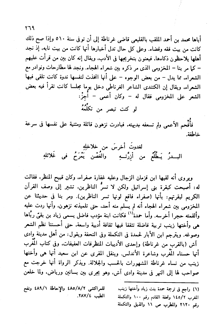(¬1) راجع فى ترجمة حمدة بنت زياد وأختها زينب المغرب 2/ 145 وتحفة القادم رقم 100 والتكملة رقم 2120 والمطرب ص 11 والذيل والتكملة للمراكشى 2/ 8/485 والإحاطة 1/ 489 ونفح الطيب 4/ 287.