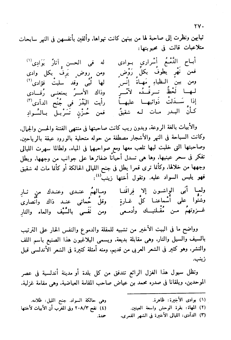 والأبيات بالغة الروعة، وبدون ريب كانت صاحبتها فى منتهى الفتنة والحسن والجمال، وكانت السباحة فى النهر والأشجار مصطفة من حوله متحلية بالورود عبقة بالرياحين، وصاحبتها التى خلبت لبها تلعب معها ومع صواحبهما فى المياه، ولطالما سهرت الليالى تفكر فى سحر عينيها، وها هى تسدل أحيانا ضفائرها على جوانب من وجهها، ويطل وجهها من خلالها، وكأنما ترى قمرا يطل فى جنح الليالى الحالكة أو كأنما مات له شقيق فهو يلبس السواد عليه. وتقول أختها زينب (¬4):