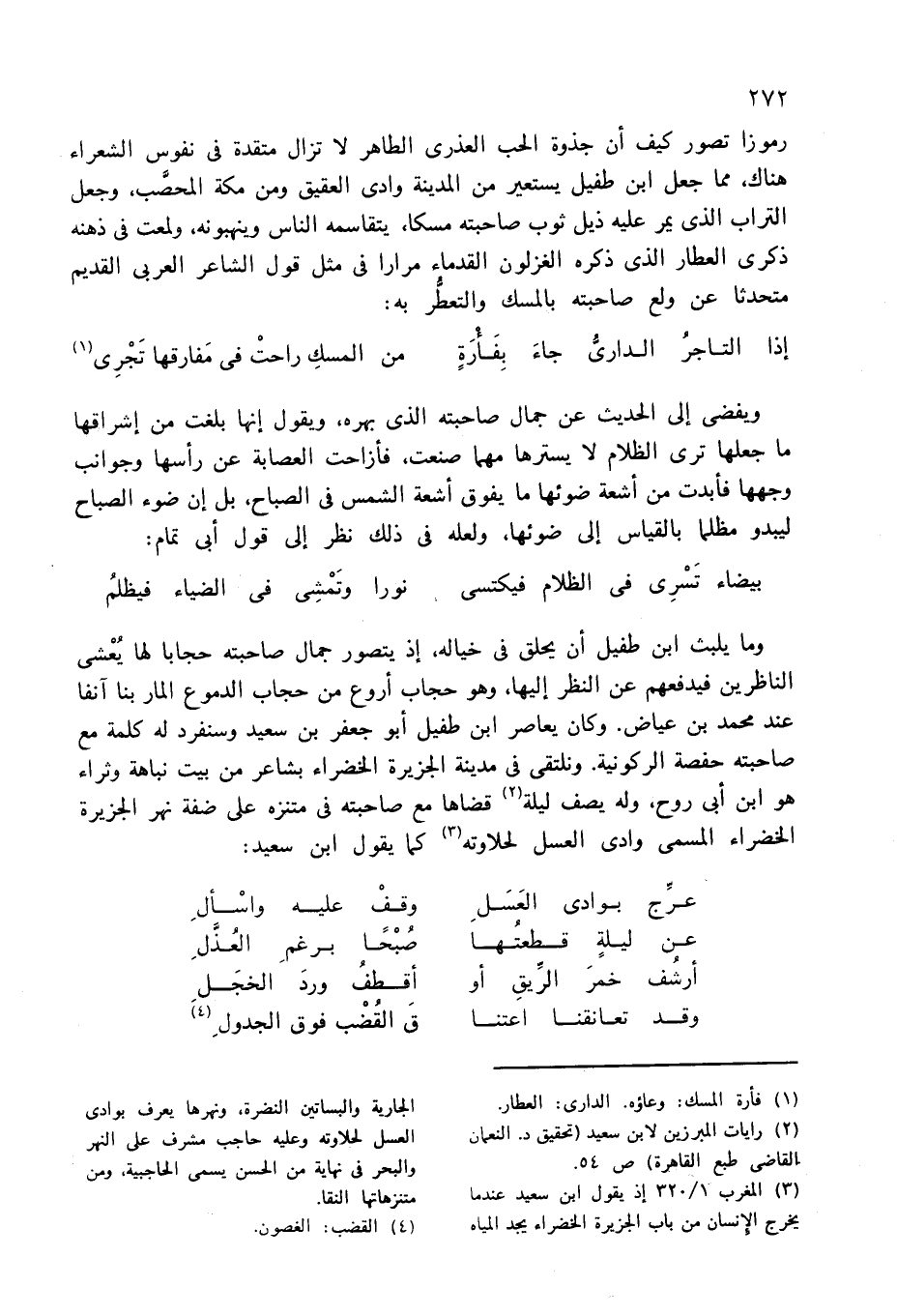 رموزا تصور كيف أن جذوة الحب العذرى الطاهر لا تزال متقدة فى نفوس الشعراء هناك، مما جعل ابن طفيل يستعير من المدينة وادى العقيق ومن مكة المحصّب، وجعل التراب الذى يمر عليه ذيل ثوب صاحبته مسكا، يتقاسمه الناس وينهبونه، ولمعت فى ذهنه ذكرى العطار الذى ذكره الغزلون القدماء مرارا فى مثل قول الشاعر العربى القديم متحدثا عن ولع صاحبته بالمسك والتعطّر به: