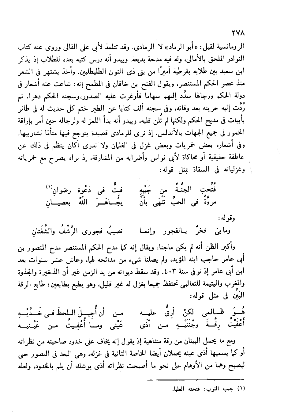 الرومانثية لقيل: «أبو الرماد» لا الرمادى. وقد تتلمذ لأبى على القالى وروى عنه كتاب النوادر الملحق بالأمالى، وله فيه مدحة بديعة. ويبدو أنه درس كتبه بعده للطلاب إذ يذكر ابن سعيد بين طلابه بقرطبة أميرا من بنى ذى النون الطليطليين. وأخذ يشتهر فى الشعر منذ عصر الحكم المستنصر، ويقول الفتح بن خاقان فى المطمح إنه: شاعت عنه أشعار فى دولة الحكم ورجالها سدّد إليهم سهاما فأوغرت عليه الصدور، وسجنه الحكم دهرا، ثم ردّت إليه حريته بعد وفاته، وفى سجنه ألف كتابا عن الطير ختم كل حديث له فى طائر بأبيات فى مديح الحكم ولكنها لم تلن قلبه، ويبدو أنه بدأ اللمز له ولرجاله حين أمر بإراقة الخمور فى جميع الجهات بالأندلس، إذ نرى للرمادى قصيدة يتوجع فيها متألما لشاربيها.