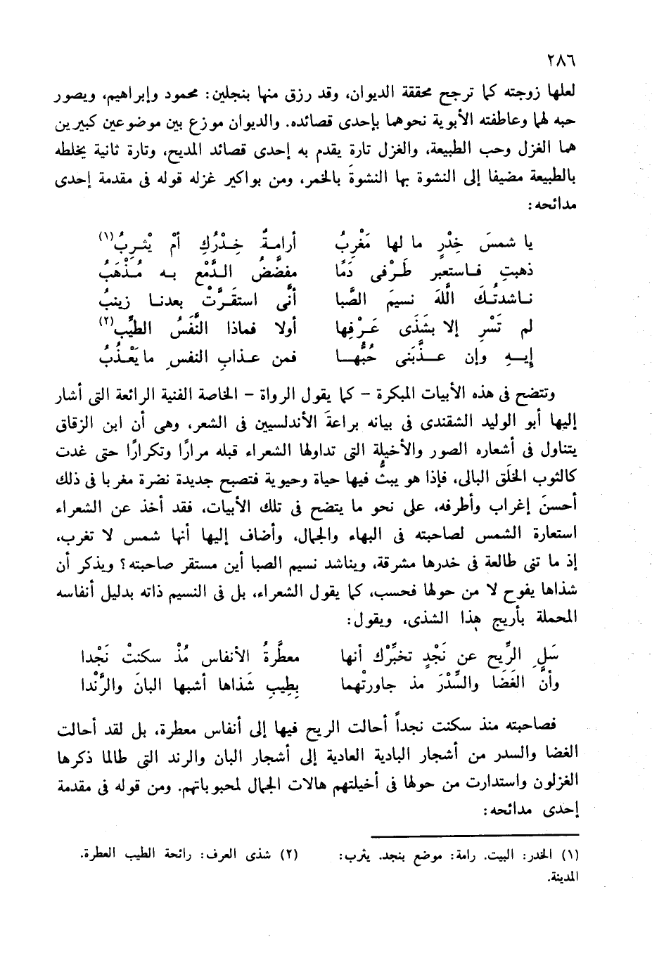 فصاحبته منذ سكنت نجدا أحالت الريح فيها إلى أنفاس معطرة، بل لقد أحالت الغضا والسدر من أشجار البادية العادية إلى أشجار البان والرند التى طالما ذكرها الغزلون واستدارت من حولها فى أخيلتهم هالات الجمال لمحبوباتهم. ومن قوله فى مقدمة إحدى مدائحه: