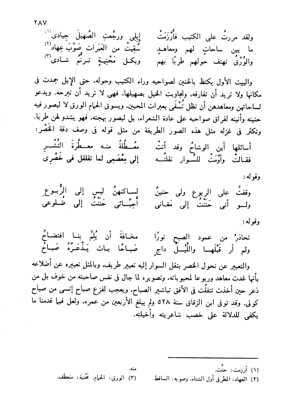 والبيت الأول يكتظ بالحنين لصواحبه وراء الكثيب وحوله، حتى الإبل جمدت فى مكانها ولا تريد أن تفارقه، وتجاوبت الخيل بصهيلها، فهى لا تريد أن تبرحه. ويدعو لساحاتهن ومعاهدهن أن تظل تسقى بعبرات المحبين، ويسوق الحمام الورق لا ليصور فيه حنينه وأنينه لفراق صواحبه على عادة الشعراء، بل ليصور بهجته، فهو يشدو لهن طربا.