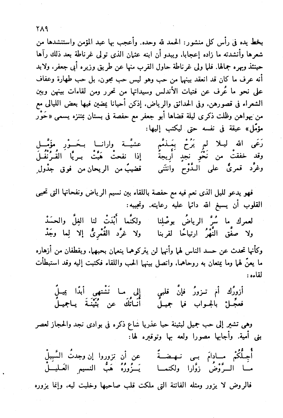 بخط يده فى رأس كل منشور: الحمد لله وحده. وأعجب بها عبد المؤمن واستنشدها من شعرها وأنشدته ما زاده إعجابا، ويبدو أن ابنه عثمان الذى تولى غرناطة بعد ذلك رآها حينئذ وبهره جمالها. فلما ولى غرناطة حاول القرب منها عن طريق وزيره أبى جعفر، ولا بد أنه عرف ما كان قد انعقد بينهما من حب وهو ليس حب مجون، بل حب طهارة وعفاف على نحو ما عرف عن فتيات الأندلس وسيداتها من تحرر ومن لقاءات بينهن وبين الشعراء فى قصورهن، وفى الحدائق والرياض، إذ كن أحيانا يمضين فيها بعض الليالى مع من يهواهن وظلت ذكرى ليلة قضاها أبو جعفر مع حفصة فى بستان بمتنزه يسمى «حور مؤمّل» عبقة فى نفسه حتى ليكتب إليها:
