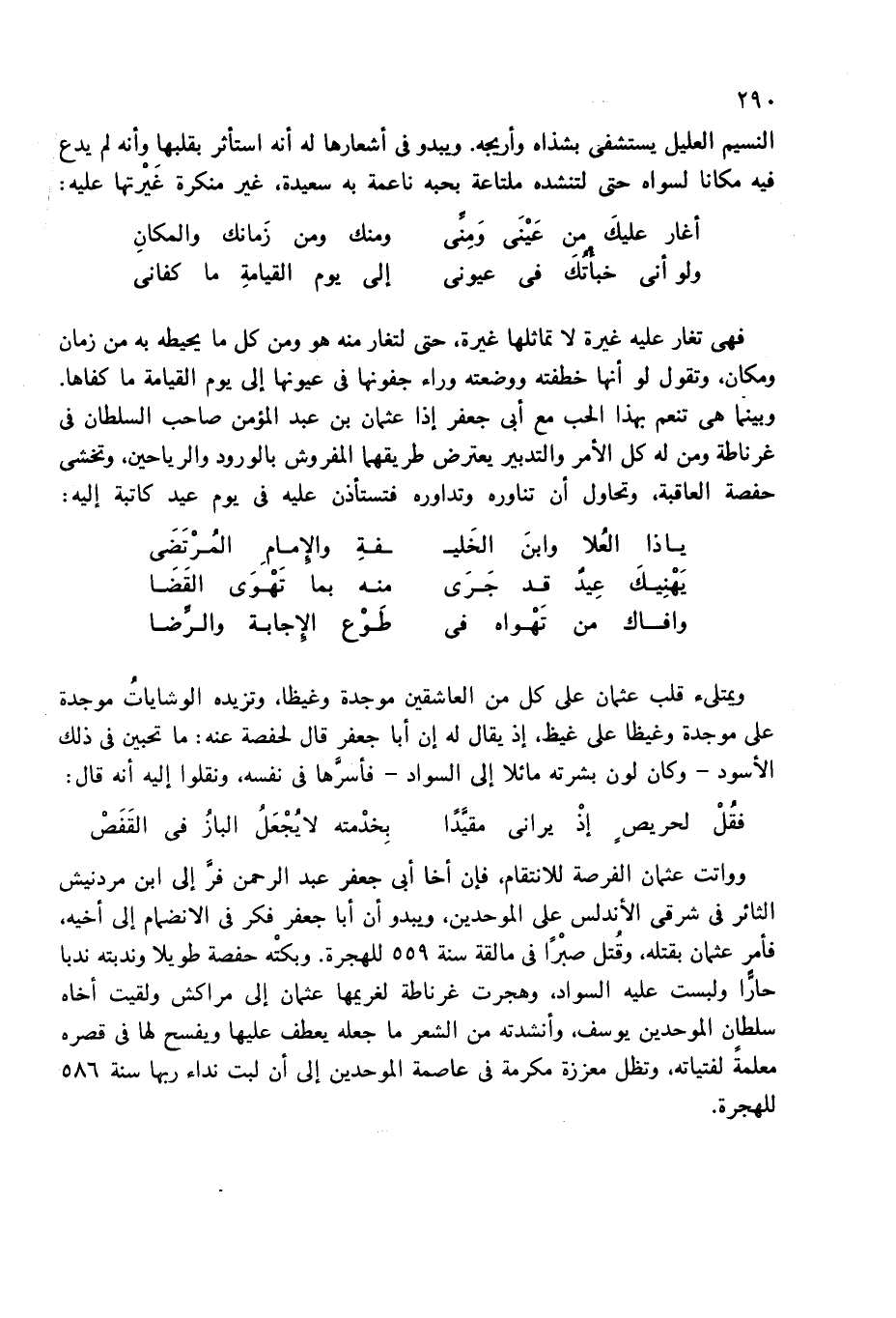 وبينما هى تنعم بهذا الحب مع أبى جعفر إذا عثمان بن عبد المؤمن صاحب السلطان فى غرناطة ومن له كل الأمر والتدبير يعترض طريقهما المفروش بالورود والرياحين، وتخشى حفصة العاقبة، وتحاول أن تناوره وتداوره فتستأذن عليه فى يوم عيد كاتبة إليه: