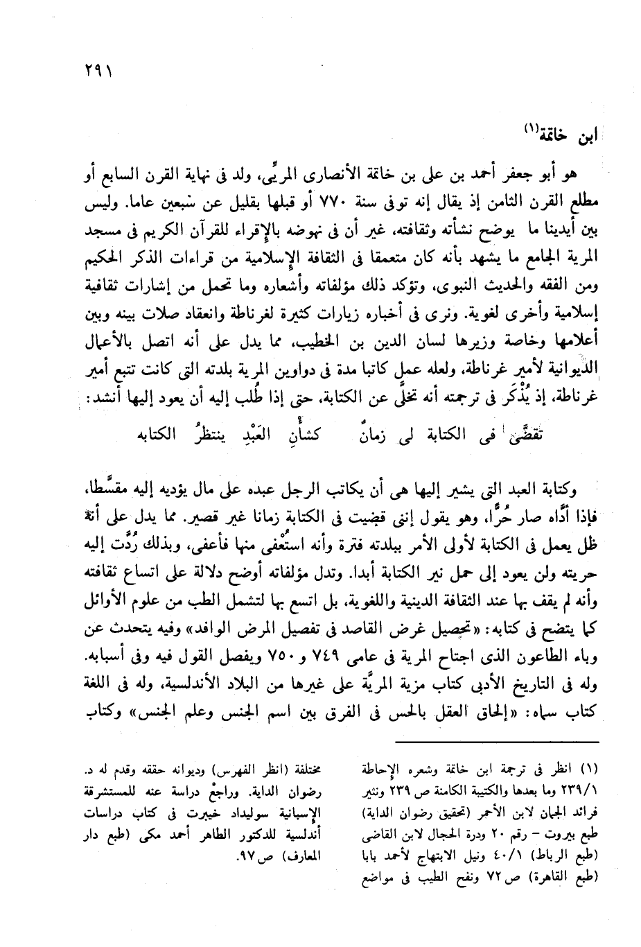 (¬1) انظر فى ترجمة ابن خاتمة وشعره الإحاطة 1/ 239 وما بعدها والكتيبة الكامنة ص 239 ونثير فرائد الجمان لابن الأحمر (تحقيق رضوان الداية) طبع بيروت-رقم 20 ودرة الحجال لابن القاضى (طبع الرباط) 1/ 40 ونيل الابتهاج لأحمد بابا (طبع القاهرة) ص 72 ونفح الطيب فى مواضع مختلفة (انظر الفهرس) وديوانه حققه وقدم له د. رضوان الداية. وراجع دراسة عند للمستشرقة الإسبانية سوليداد خيبرت فى كتاب دراسات أندلسية للدكتور الطاهر أحمد مكى (طبع دار المعارف) ص 97.