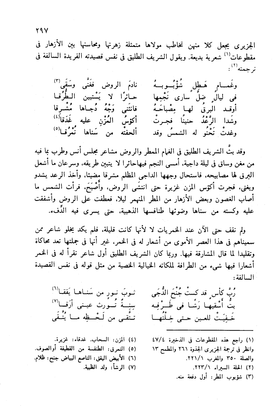 الجزيرى يجعل كلا منهن تخاطب مولاها متمثلة زهرتها ومحاسنها بين الأزهار فى مقطوعات (¬1) شعرية بديعة. ويقول الشريف الطليق فى نفس قصيدته الفريدة السالفة فى ترجمته (¬2):