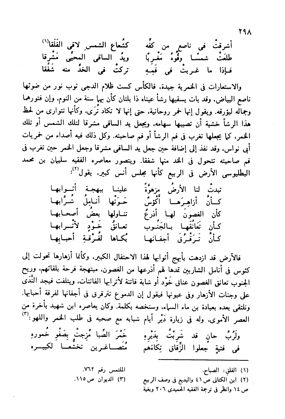 والاستعارات فى الخمرية جيدة، فالكأس كست ظلام الدجى ثوب نور من ضوئها ناصع البياض، وقد بات يسقيها رشأ عيناه ذا بلتان كأن بهما سنة من النوم، وإن فتورهما وجماله ليؤرقه. ويقول إنها خمر روحانية، حتى إنها لا تكاد ترى، وكأنها تتوارى من لحظ هذا الرشأ خشية أن تصيبها سهامه، ويجعل يد الساقى مشرقا لتلك الشمس أو تلك الخمر، كما يجعلها تغرب فى فم الرشأ أو فم صاحبته. وكل ذلك فيه أصداء من خمريات أبى نواس، وقد نفذ إلى إضافة حين جعل يد الساقى مشرقا وجعل الخمر حين تغرب فى فم صاحبته تتحول فى الخد منها شفقا. ويتصور معاصره الفقيه سليمان بن محمد البطليوسى الأرض فى الربيع كأنها مجلس أنس كبير، يقول (¬2):