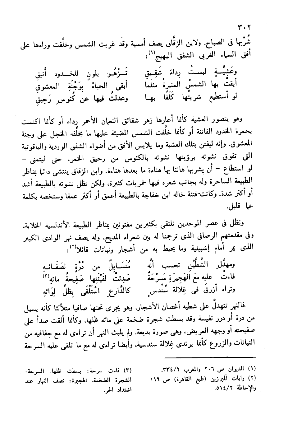 وهو يتصور العشية كأنما أعارها زهر شقائق النعمان الأحمر رداء أو كأنما اكتست بحمرة الخدود الفاتنة أو كأنما خلّفت الشمس المضيئة عليها ما يخلّفه الخجل على وجنة المعشوق. وإنه ليفتن بتلك العشية وما يلابس الأفق من أضواء الشفق الوردية والياقوتية التى تفوق نشوته برؤيتها نشوته بالكئوس من رحيق الخمر، حتى ليتمنى- لو استطاع-أن يشربها هانئا بها هناءة ما بعدها هناءة. وابن الزقاق ينتشى دائما بمناظر الطبيعة الساحرة وله بجانب شعره فيها خمريات كثيرة، ولكن تظل نشوته بالطبيعة أشد أو أكثر شدة. وكانت فتنة خاله ابن خفاجة بالطبيعة أعمق أو أكثر عمقا وسنخصه بكلمة عما قليل.
