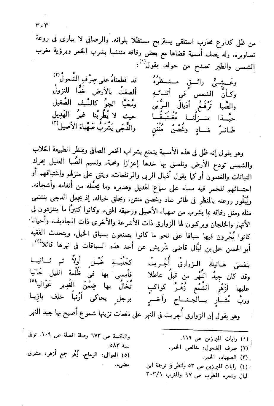 وهو يقول إنه ظل فى هذه الأمسية يتمتع بشراب الخمر الصافى وبمنظر الطبيعة الخلاب والشمس تودع الأرض وتلصق بها خدها إعزازا ومحبة، ونسيم الصّبا العليل يحرك النباتات والغصون أو كما يقول أذيال الربى والمرتفعات، ويثنى على منزلهم واغتباقهم أو احتسائهم للخمر فيه مساء على سماع الهديل وهديره وما يحمّله من أنغامه وأشجانه.