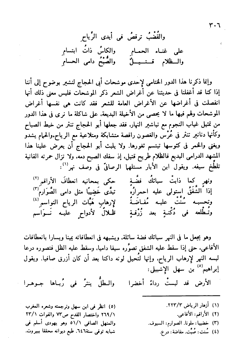 وإنما ذكرنا هذا الدور الختامى لإحدى موشحات أبى الحجاج لنشير بوضوح إلى أننا إذا كنا قد أغفلنا فى حديثنا عن أغراض الشعر ذكر الموشحات فليس معنى ذلك أنها انفصلت فى أغراضها عن الأغراض العامة للشعر فقد كانت هى نفسها أغراض الموشحات ولهم فيها ما لا يحصى من الأخيلة البديعة، على شاكلة ما نرى فى هذا الدور من تمثيل غياب النجوم مع تباشير النهار، فقد جعلها أبو الحجاج تنثر من خيط الصباح وكأنها دنانير تنثر فى عرس والغصون راقصة متشابكة ومتلاعبة مع الرياح، والحمام يشدو ويغنى والخمر فى كئوسها تبتسم ثغورها. ولا يلبث أبو الحجاج أن يعرض علينا هذا المشهد الدرامى البديع فالظلام طريح قتيل، إذ سفك الصبح دمه، ولا تزال حمرته القانية تلطّخ سيفه. ويقول ابن الأبار مستلهما الرصافىّ فى وصف نهر (¬1):