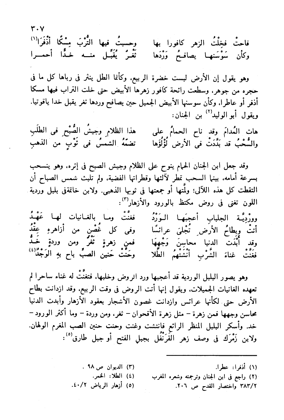 وقد جعل ابن الجنان الحمام ينوح على الظلام وجيش الصبح فى إثره، وهو ينسحب بسرعة أمامه، بينما السحب تمطر لآلئها وقطراتها الفضية، ولم تلبث شمس الصباح أن التقطت كل هذه اللآلى؛ ولّمتها أو جمعتها فى ثوبها الذهبى. ولابن خاتمة فى بلبل وردية اللون تغنى فى روض مكتظ بالورود والأزهار (¬3):