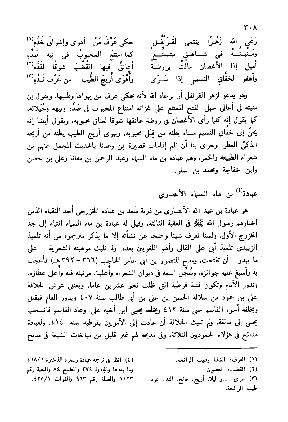 وهو يدعو لزهر القرنفل أن يرعاه الله لأنه يحكى عرف من يهواها وطيبها، ويقول إن منبته فى أعالى جبل الفتح الممتنع على غزاته امتناع المحبوب فى صدّه وتيهه وخيلائه، كما يقول إنه كلما رأى الأغصان فى روضة عانقها شوقا لعناق محبوبه، ويقول أيضا إنه يحنّ إلى خفّاق النسيم مساء يظنه من قبل محبوبه، ويهوى أريج الطيب يظنه من أريجه الذكىّ العطر. وحرى بنا أن نلم إلمامات قصيرة بمن وعدنا بالحديث المجمل عنهم من شعراء الطبيعة والخمر، وهم عبادة بن ماء السماء وعبد الرحمن بن مقانا وعلى بن حصن وابن خفاجة ومحمد بن سفر.
