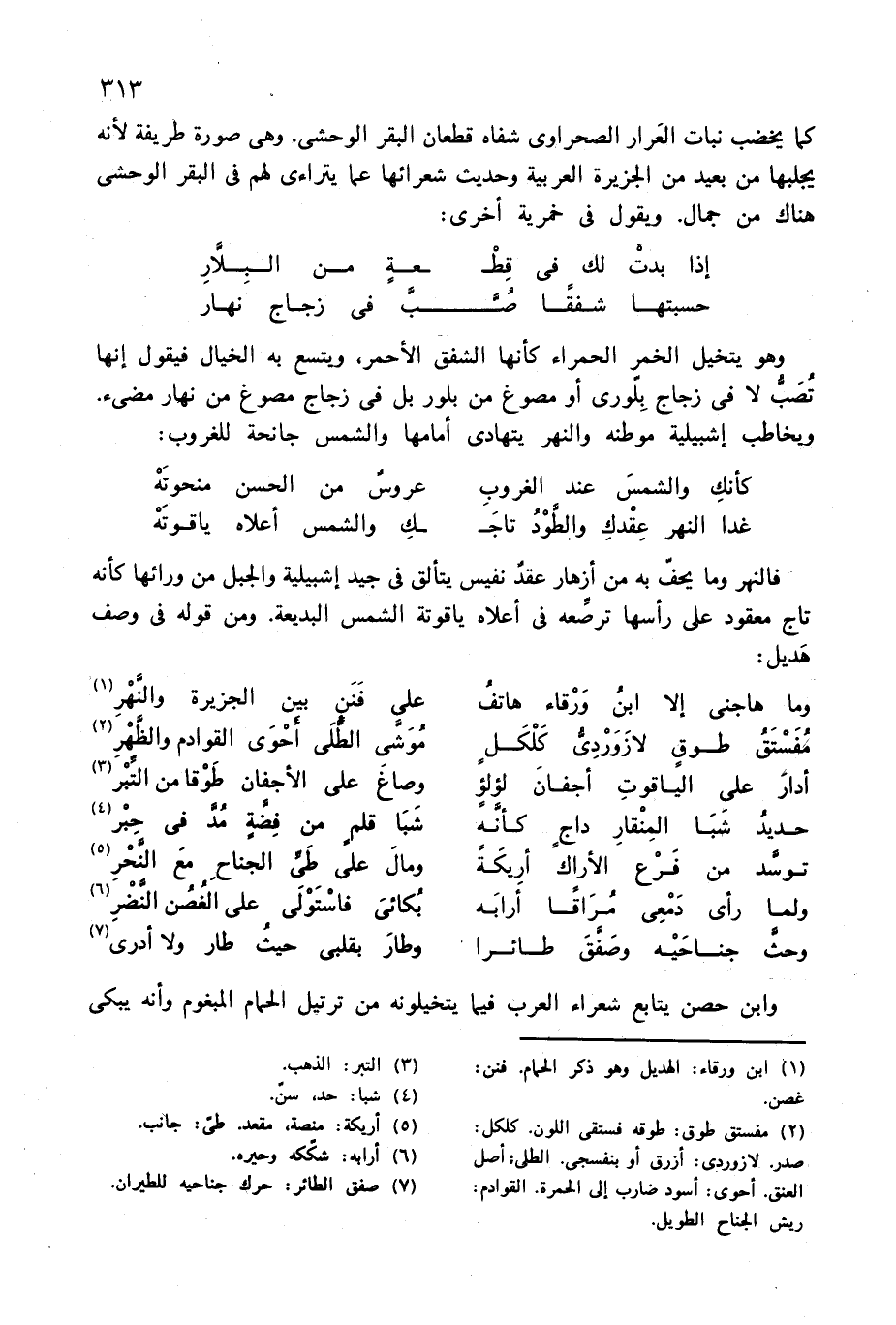 فالنهر وما يحفّ به من أزهار عقد نفيس يتألق فى جيد إشبيلية والجبل من ورائها كأنه تاج معقود على رأسها ترصّعه فى أعلاه ياقوتة الشمس البديعة. ومن قوله فى وصف هديل: