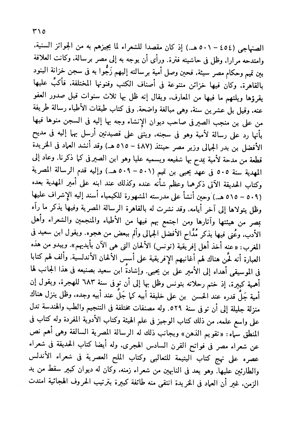 الصنهاجى (454 - 501 هـ.) إذ كان مقصدا للشعراء لما يجيزهم به من الجوائز السنية، وامتدحه مرارا، وظل فى حاشيته فترة. ورأى أن يوجه به إلى مصر برسالة، وكانت العلاقة بين تميم وحكام مصر سيئة، فحين وصل أمية برسالته إليهم زجّوا به فى سجن خزانة البنود بالقاهرة، وكان فيها خزائن متنوعة فى أصناف الكتب وفنونها المختلفة، فأكبّ عليها يقرؤها ويلتهم ما فيها من المعارف، ويقال إنه ظل بها ثلاث سنوات قبل صدور العفو عنه، وقيل بل عشرين سنة، وهى مبالغة واضحة. وفى كتاب طبقات الأطباء رسالة طريفة من على بن منجب الصيرفى صاحب ديوان الإنشاء وجه بها إليه فى السجن منوها فيها بأنها رد على رسالة لأمية وهو فى سجنه، ويثنى على قصيدتين أرسل بهما إليه فى مديح الأفضل بن بدر الجمالى وزير مصر حينئذ (487 - 515 هـ) وقد أنشد العماد فى الخريدة قطعة من مدحة لأمية يمدح بها شفيعه ويسميه عليا وهو ابن الصيرفى كما ذكرنا. وعاد إلى المهدية سنة 505 فى عهد يحيى بن تميم (501 - 509 هـ.) وإليه قدم الرسالة المصرية وكتاب الحديقة الآتى ذكرهما وعظم شأنه عنده وكذلك عند ابنه على أمير المهدية بعده (509 - 515 هـ.) وحين أنشأ على مدرسته المشهورة للكيمياء أسند إليه الإشراف عليها وظل يتولاها إلى آخر أيامه. وقد نشرت له بالقاهرة الرسالة المصرية وفيها يذكر ما رآه بمصر من هيئتها وآثارها ومن اجتمع بهم فيها من الأطباء والمنجمين والشعراء وأهل الأدب، وعنى فيها بذكر مدّاح الأفضل الجمالى وألم ببعض من هجوه. ويقول ابن سعيد فى المغرب: «عنه أخذ أهل إفريقية (تونس) الألحان التى هى الآن بأيديهم». ويبدو من هذه العبارة أنه لحّن هناك لهم أغانيهم الإفريقية على أسس الألحان الأندلسية. وألف لهم كتابا فى الموسيقى أهداه إلى الأمير على بن يحيى. وإشادة ابن سعيد بصنيعه فى هذا الجانب لها أهمية كبيرة، إذ ختم رحلاته بتونس وظل بها إلى أن توفى سنة 683 للهجرة، ويقول إن أمية جلّ قدره عند الحسن بن على خليفة أبيه كما جلّ عند أبيه وجده، وظل ينزل هناك منزلة جليلة إلى أن توفى سنة 529. وله مصنفات مختلفة فى التنجيم والطب والهندسة تدل على واسع علمه، من ذلك كتاب الوجيز فى علم الهيئة وكتاب الأدوية المفردة وله كتاب فى المنطق سماه: «تقويم الذهن» وبجانب ذلك له الرسالة المصرية السالفة وهى أهم نص عن شعراء مصر فى فواتح القرن السادس الهجرى، وله أيضا كتاب الحديقة فى شعراء عصره على نهج كتاب اليتيمة للثعالبى وكتاب الملح العصرية فى شعراء الأندلس والطارئين عليها. وهو يعد فى النابهين من شعراء زمنه، وكان له ديوان كبير سقط من يد الزمن، غير أن العماد فى الخريدة انتقى منه طائفة كبيرة بترتيب الحروف الهجائية امتدت