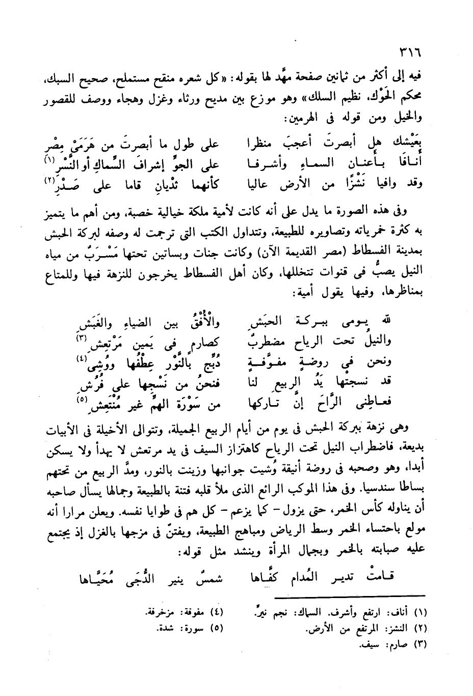 وهى نزهة ببركة الحبش فى يوم من أيام الربيع الجميلة، وتتوالى الأخيلة فى الأبيات بديعة، فاضطراب النيل تحت الرياح كاهتزاز السيف فى يد مرتعش لا يهدأ ولا يسكن أبدا، وهو وصحبه فى روضة أنيقة وشيت جوانبها وزينت بالنور، ومدّ الربيع من تحتهم بساطا سندسيا. وفى هذا الموكب الرائع الذى ملأ قلبه فتنة بالطبيعة وجمالها يسأل صاحبه أن يناوله كأس الخمر، حتى يزول-كما يزعم-كل هم فى طوايا نفسه. ويعلن مرارا أنه مولع باحتساء الخمر وسط الرياض ومباهج الطبيعة، ويفتنّ فى مزجها بالغزل إذ يجتمع عليه صبابته بالخمر وبجمال المرأة وينشد مثل قوله:
