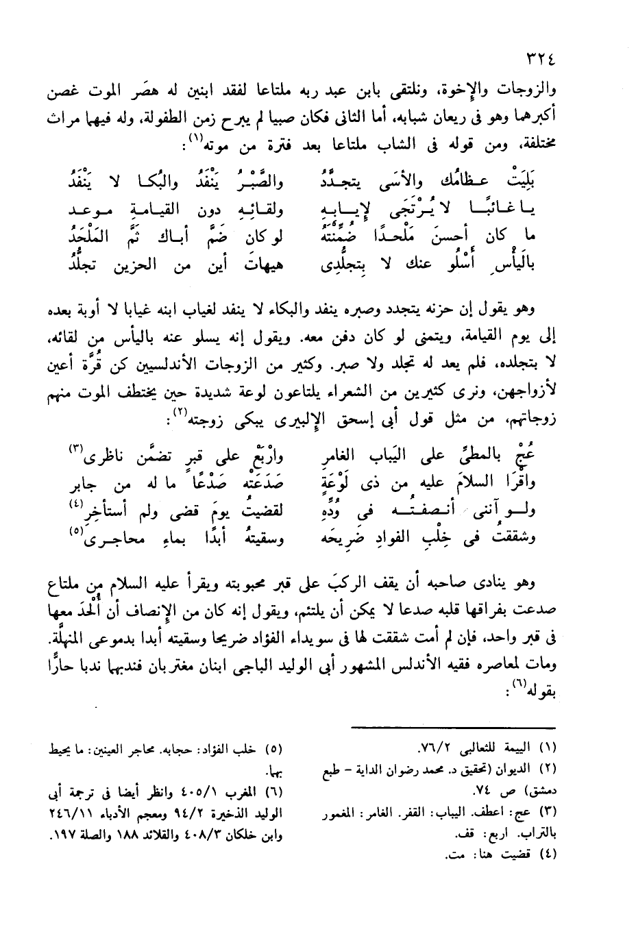 وهو يقول إن حزنه يتجدد وصبره ينفد والبكاء لا ينفد لغياب ابنه غيابا لا أوبة بعده إلى يوم القيامة، ويتمنى لو كان دفن معه. ويقول إنه يسلو عنه باليأس من لقائه، لا بتجلده، فلم يعد له تجلد ولا صبر. وكثير من الزوجات الأندلسيين كن قرّة أعين لأزواجهن، ونرى كثيرين من الشعراء يلتاعون لوعة شديدة حين يختطف الموت منهم زوجاتهم، من مثل قول أبى إسحق الإلبيرى يبكى زوجته (¬2):