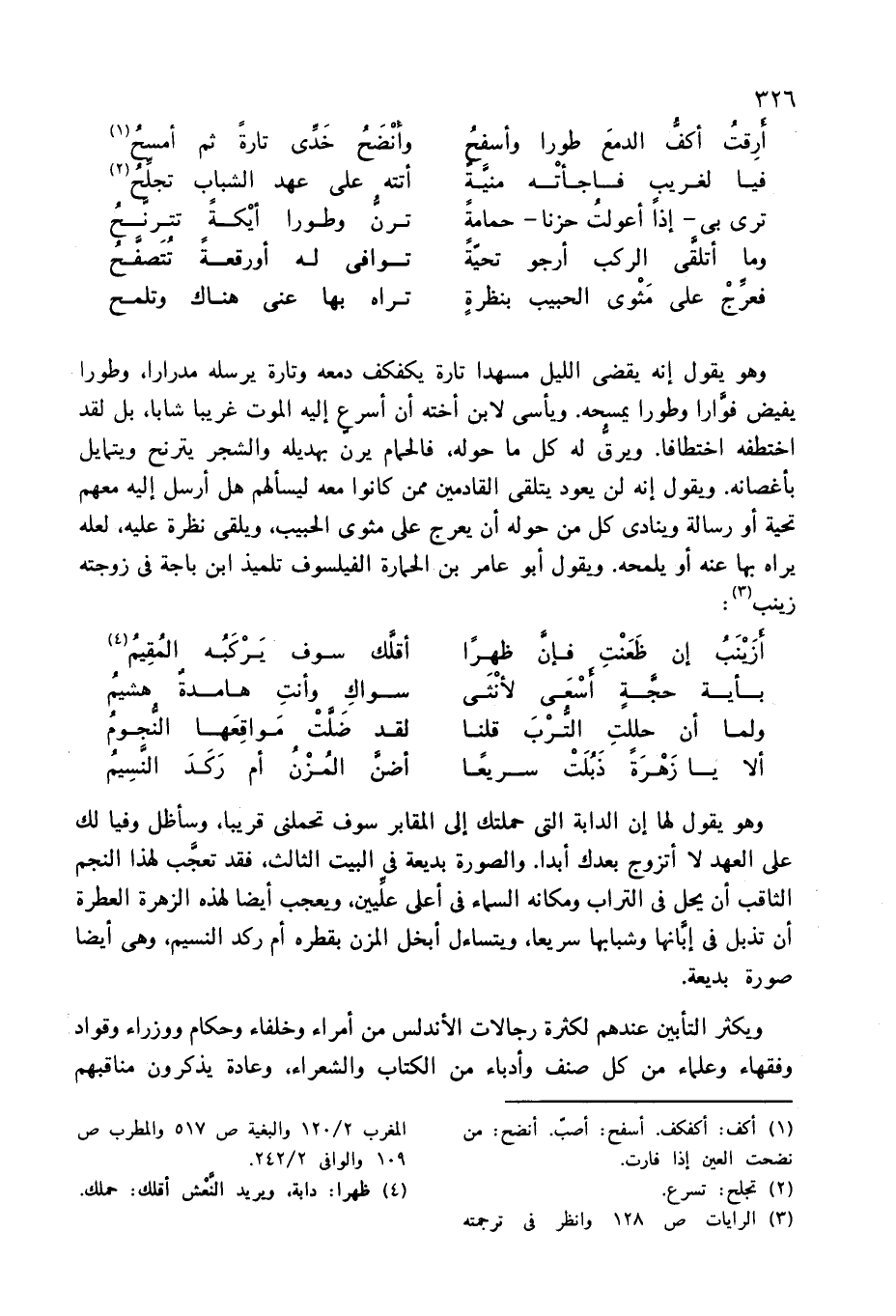 وهو يقول إنه يقضى الليل مسهدا تارة يكفكف دمعه وتارة يرسله مدرارا، وطورا يفيض فوّارا وطورا يمسحه. ويأسى لابن أخته أن أسرع إليه الموت غريبا شابا، بل لقد اختطفه اختطافا. ويرقّ له كل ما حوله، فالحمام يرن بهديله والشجر يترنح ويتمايل بأغصانه. ويقول إنه لن يعود يتلقى القادمين ممن كانوا معه ليسألهم هل أرسل إليه معهم تحية أو رسالة وينادى كل من حوله أن يعرج على مثوى الحبيب، ويلقى نظرة عليه، لعله يراه بها عنه أو يلمحه. ويقول أبو عامر بن الحمارة الفيلسوف تلميذ ابن باجة فى زوجته زينب (¬3):