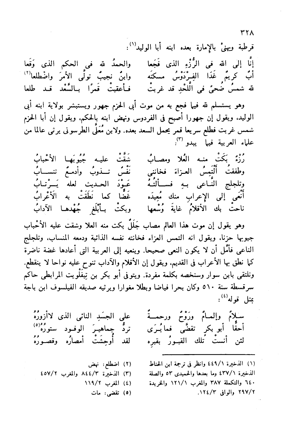 وهو يستسلم لله فيما فجع به من موت أبى الحزم جهور ويستبشر بولاية ابنه أبى الوليد، ويقول إن جهورا أصبح فى الفردوس ونهض ابنه بالحكم، ويقول إن أبا الحزم شمس غربت فطلع سريعا قمر يحمل السعد بعده. ولابن معلّى الطرسونى يرثى عالما من علماء العربية فيما يبدو (¬3):
