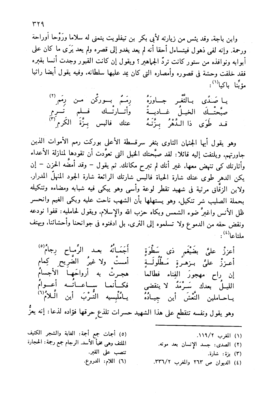 وهو يقول أيها الجثمان الثاوى بثغر سرقسطة الأعلى بوركت رمم الأموات الذين جاورتهم، ويلتفت إليه قائلا: لقد صبّحتك الخيل التى تعوّدت أن تقودها لمنازلة الأعداء وأثارتك كى تنهض معها، غير أنك لم تبرح مكانك. ثم يقول-وقد أمضّه الحزن-إن يكن الدهر طوى عنك شارة الحياة فالبس شارتك الرائعة شارة الجود المنهلّ المدرار.