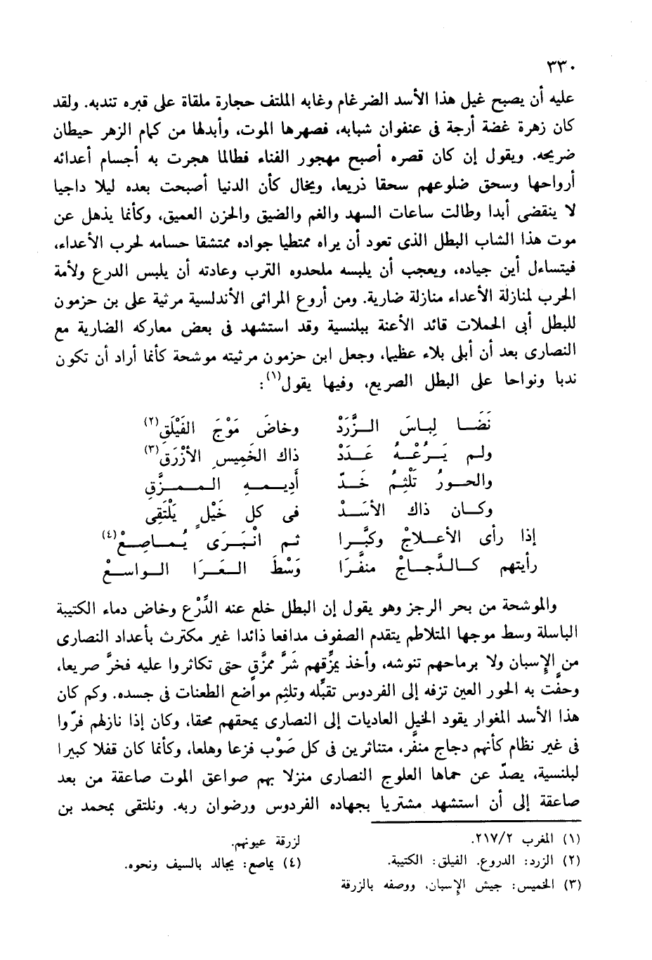 والموشحة من بحر الرجز وهو يقول إن البطل خلع عنه الدّرع وخاض دماء الكتيبة الباسلة وسط موجها المتلاطم يتقدم الصفوف مدافعا ذائدا غير مكترث بأعداد النصارى من الإسبان ولا برماحهم تنوشه، وأخذ يمزّقهم شرّ ممزّق حتى تكاثروا عليه فخرّ صريعا، وحفّت به الحور العين تزفه إلى الفردوس تقبّله وتلثم مواضع الطعنات فى جسده. وكم كان هذا الأسد المغوار يقود الخيل العاديات إلى النصارى يمحقهم محقا، وكان إذا نازلهم فرّوا فى غير نظام كأنهم دجاج منفّر، متناثرين فى كل صوب فزعا وهلعا، وكأنما كان قفلا كبيرا لبلنسية، يصدّ عن حماها العلوج النصارى منزلا بهم صواعق الموت صاعقة من بعد صاعقة إلى أن استشهد مشتريا بجهاده الفردوس ورضوان ربه. ونلتقى بمحمد بن