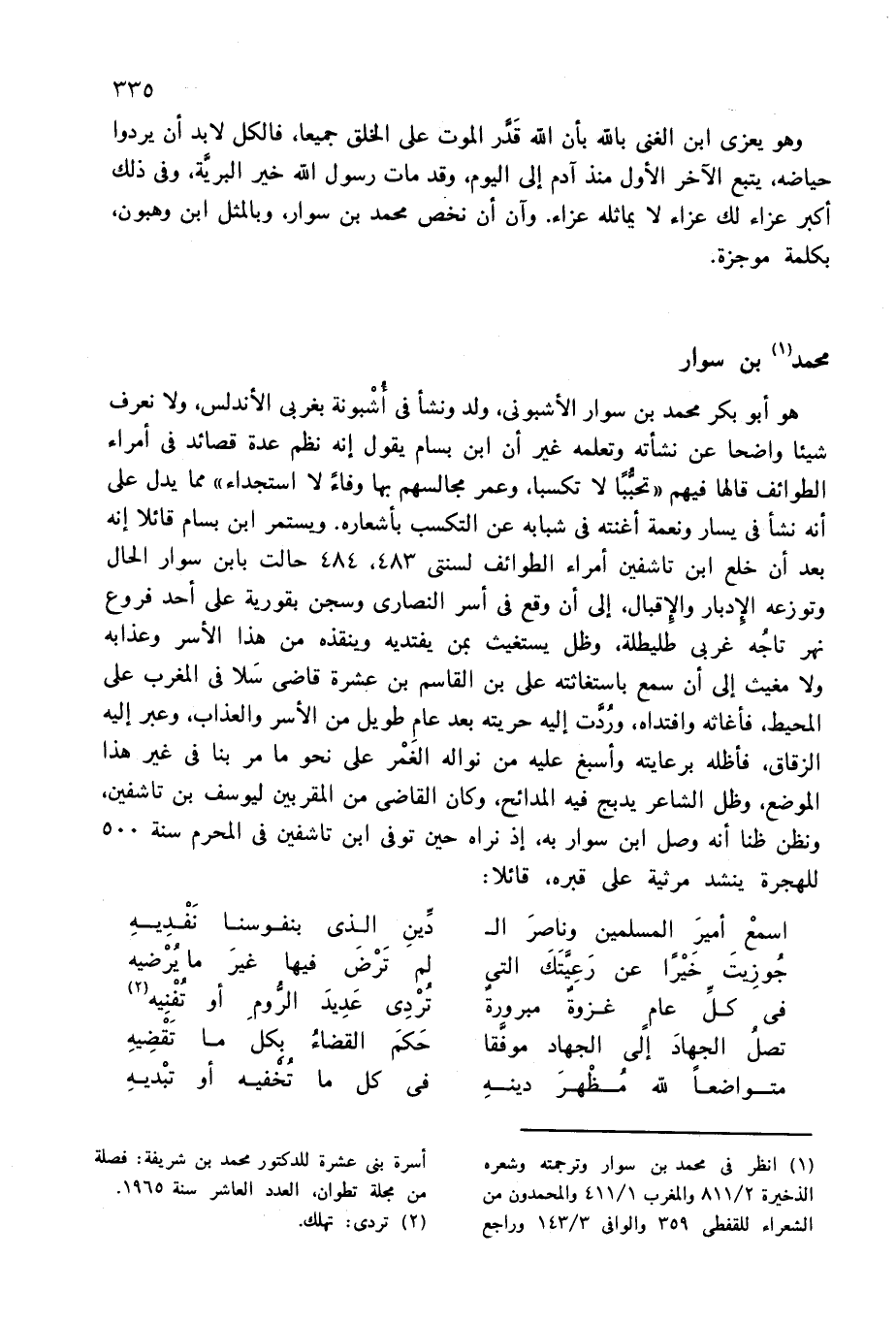 (¬1) انظر فى محمد بن سوار وترجمته وشعره الذخيرة 2/ 811 والمغرب 1/ 411 والمحمدون من الشعراء للقفطى 359 والوافى 3/ 143 وراجع أسرة بنى عشرة للدكتور محمد بن شريفة: فصلة من مجلة تطوان، العدد العاشر سنة 1965.