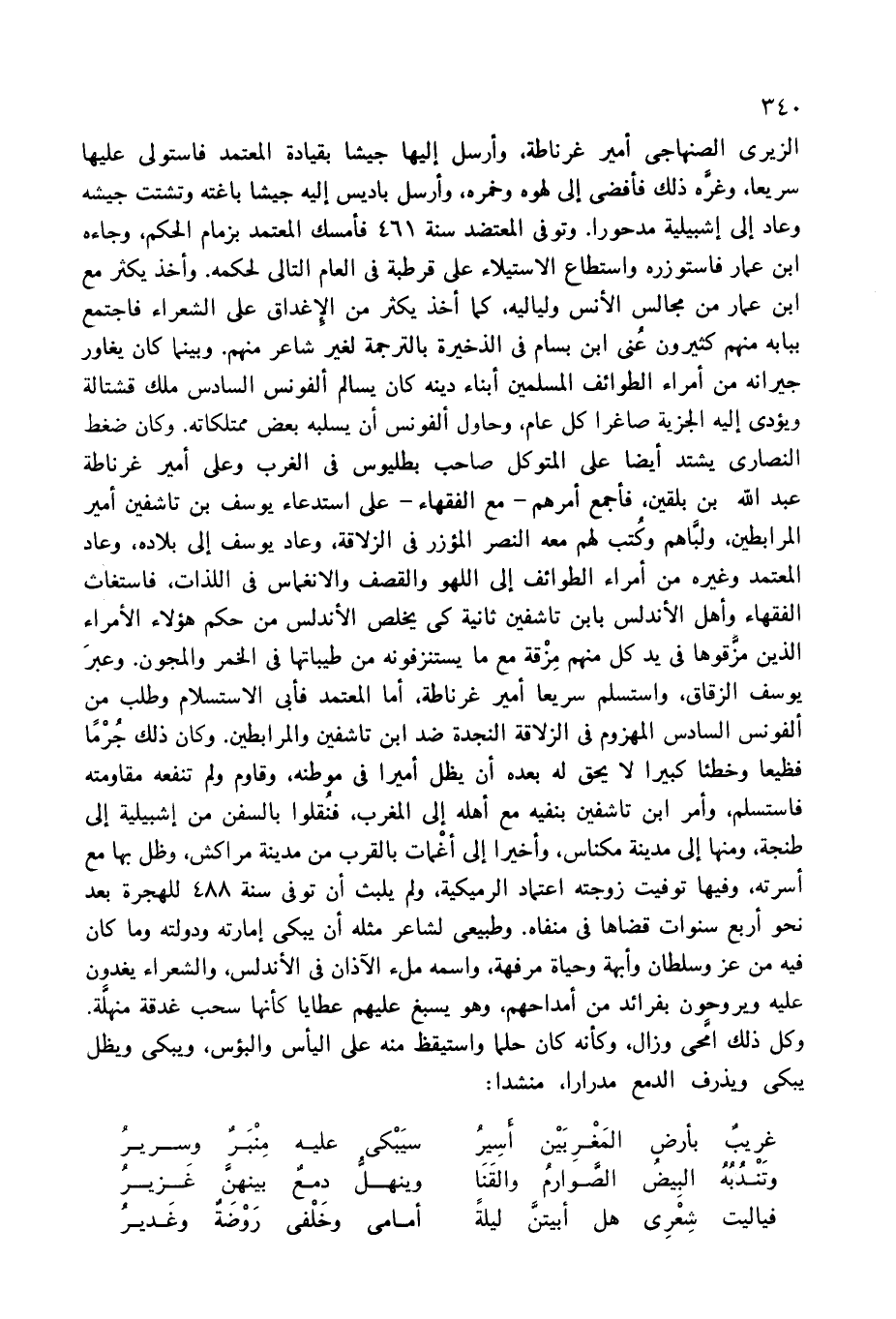 الزيرى الصنهاجى أمير غرناطة، وأرسل إليها جيشا بقيادة المعتمد فاستولى عليها سريعا، وغرّه ذلك فأفضى إلى لهوه وخمره، وأرسل باديس إليه جيشا باغته وتشتت جيشه وعاد إلى إشبيلية مدحورا. وتوفى المعتضد سنة 461 فأمسك المعتمد بزمام الحكم، وجاءه ابن عمار فاستوزره واستطاع الاستيلاء على قرطبة فى العام التالى لحكمه. وأخذ يكثر مع ابن عمار من مجالس الأنس ولياليه، كما أخذ يكثر من الإغداق على الشعراء فاجتمع ببابه منهم كثيرون عنى ابن بسام فى الذخيرة بالترجمة لغير شاعر منهم. وبينما كان يغاور جيرانه من أمراء الطوائف المسلمين أبناء دينه كان يسالم ألفونس السادس ملك قشتالة ويؤدى إليه الجزية صاغرا كل عام، وحاول ألفونس أن يسلبه بعض ممتلكاته. وكان ضغط النصارى يشتد أيضا على المتوكل صاحب بطليوس فى الغرب وعلى أمير غرناطة عبد الله بن بلقين، فأجمع أمرهم-مع الفقهاء-على استدعاء يوسف بن تاشفين أمير المرابطين، ولبّاهم وكتب لهم معه النصر المؤزر فى الزلاقة، وعاد يوسف إلى بلاده، وعاد المعتمد وغيره من أمراء الطوائف إلى اللهو والقصف والانغماس فى اللذات، فاستغاث الفقهاء وأهل الأندلس بابن تاشفين ثانية كى يخلص الأندلس من حكم هؤلاء الأمراء الذين مزّقوها فى يد كل منهم مزقة مع ما يستنزفونه من طيباتها فى الخمر والمجون. وعبر يوسف الزقاق، واستسلم سريعا أمير غرناطة، أما المعتمد فأبى الاستسلام وطلب من ألفونس السادس المهزوم فى الزلاقة النجدة ضد ابن تاشفين والمرابطين. وكان ذلك جرما فظيعا وخطئا كبيرا لا يحق له بعده أن يظل أميرا فى موطنه، وقاوم ولم تنفعه مقاومته فاستسلم، وأمر ابن تاشفين بنفيه مع أهله إلى المغرب، فنقلوا بالسفن من إشبيلية إلى طنجة، ومنها إلى مدينة مكناس، وأخيرا إلى أغمات بالقرب من مدينة مراكش، وظل بها مع أسرته، وفيها توفيت زوجته اعتماد الرميكية، ولم يلبث أن توفى سنة 488 للهجرة بعد نحو أربع سنوات قضاها فى منفاه. وطبيعى لشاعر مثله أن يبكى إمارته ودولته وما كان فيه من عز وسلطان وأبهة وحياة مرفهة، واسمه ملء الآذان فى الأندلس، والشعراء يغدون عليه ويروحون بفرائد من أمداحهم، وهو يسبغ عليهم عطايا كأنها سحب غدقة منهلّة.