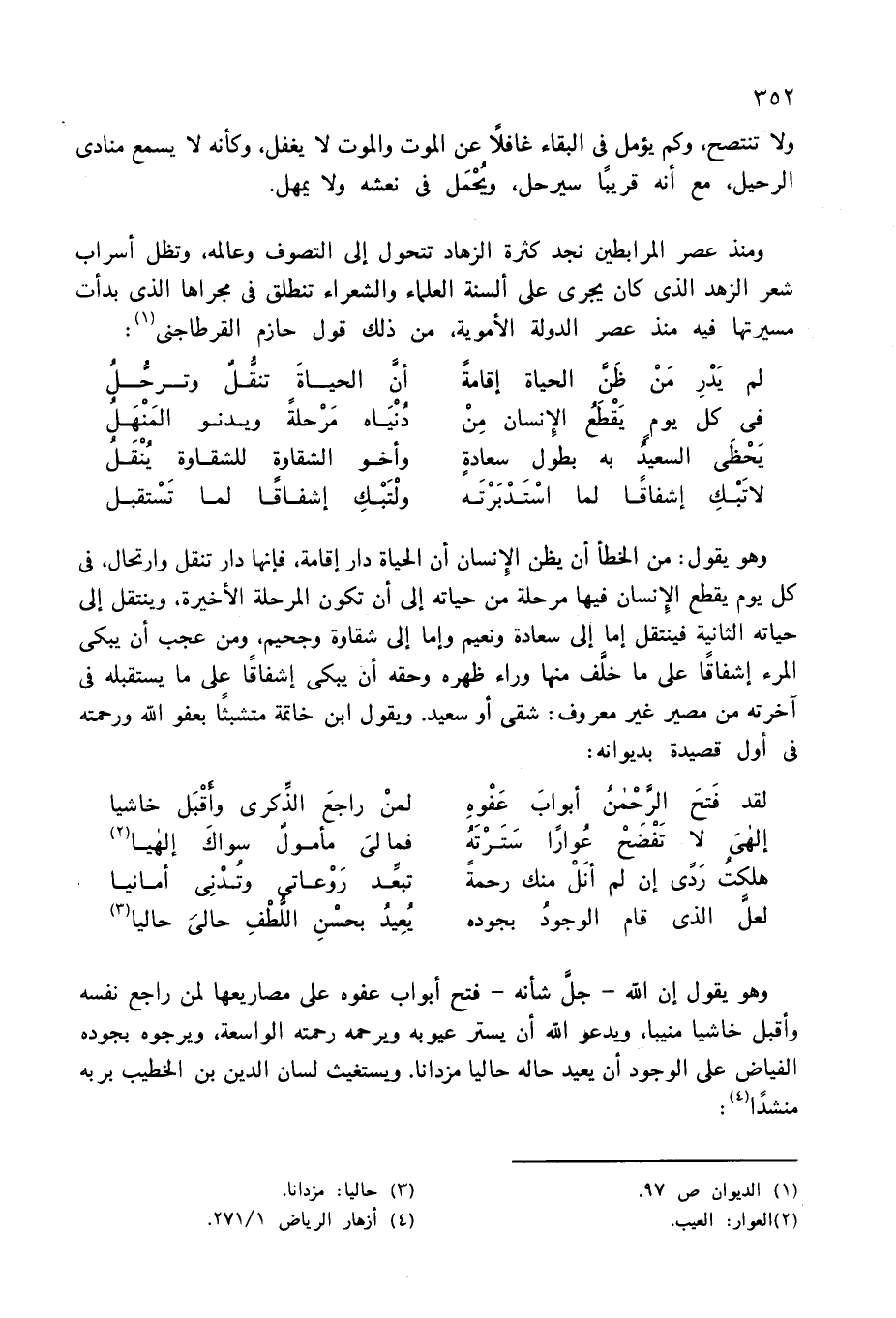 وهو يقول: من الخطأ أن يظن الإنسان أن الحياة دار إقامة، فإنها دار تنقل وارتحال، فى كل يوم يقطع الإنسان فيها مرحلة من حياته إلى أن تكون المرحلة الأخيرة، وينتقل إلى حياته الثانية فينتقل إما إلى سعادة ونعيم وإما إلى شقاوة وجحيم، ومن عجب أن يبكى المرء إشفاقا على ما خلّف منها وراء ظهره وحقه أن يبكى إشفاقا على ما يستقبله فى آخرته من مصير غير معروف: شقى أو سعيد. ويقول ابن خاتمة متشبثا بعفو الله ورحمته فى أول قصيدة بديوانه: