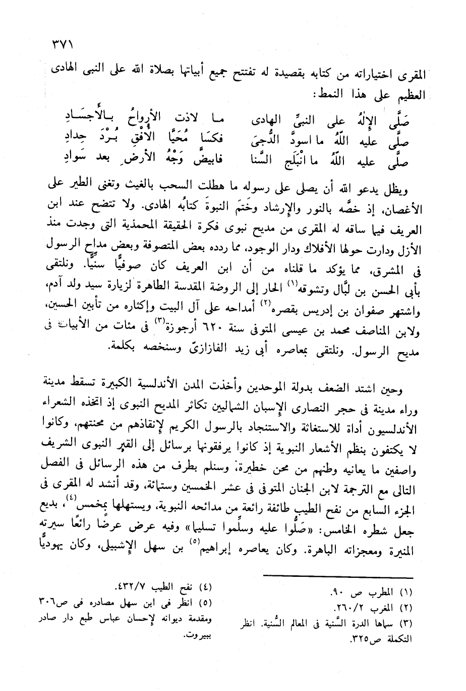 ويظل يدعو الله أن يصلى على رسوله ما هطلت السحب بالغيث وتغنى الطير على الأغصان، إذ خصّه بالنور والإرشاد وختم النبوة كتابه الهادى. ولا تتضح عند ابن العريف فيما ساقه له المقرى من مديح نبوى فكرة الحقيقة المحمدية التى وجدت منذ الأزل ودارت حولها الأفلاك ودار الوجود، مما ردده بعض المتصوفة وبعض مداح الرسول فى المشرق، مما يؤكد ما قلناه من أن ابن العريف كان صوفيّا سنّيّا. ونلتقى بأبى الحسن بن لبّال وتشوقه (¬1) الحار إلى الروضة المقدسة الطاهرة لزيارة سيد ولد آدم، واشتهر صفوان بن إدريس بقصره (¬2) أمداحه على آل البيت وإكثاره من تأبين الحسين، ولابن المناصف محمد بن عيسى المتوفى سنة 620 أرجوزة (¬3) فى مئات من الأبيات فى مديح الرسول. ونلتقى بمعاصره أبى زيد الفازازىّ وسنخصه بكلمة.