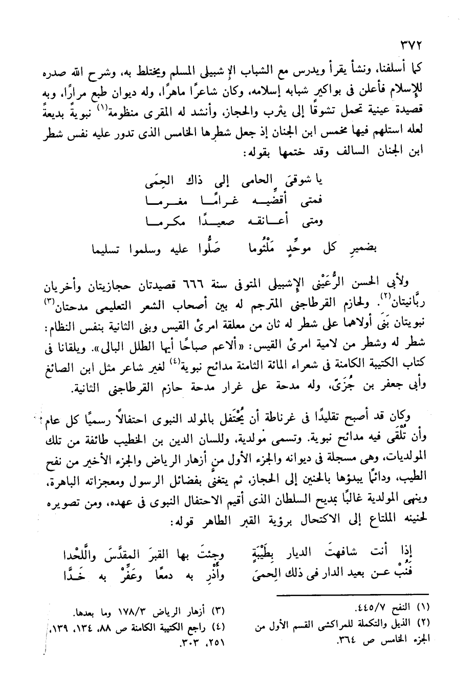 شطر له وشطر من لامية امرئ القيس: «ألا عم صباحا أيها الطلل البالى». ويلقانا فى كتاب الكتيبة الكامنة فى شعراء المائة الثامنة مدائح نبوية (¬4) لغير شاعر مثل ابن الصائغ وأبى جعفر بن جزىّ، وله مدحة على غرار مدحة حازم القرطاجنى الثانية.