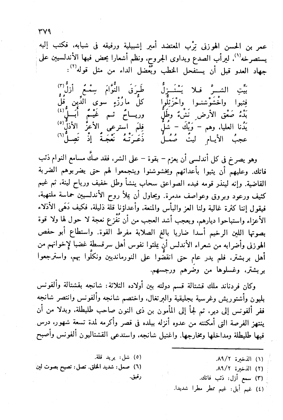عمر بن الحسن الهوزنى ترب المعتضد أمير إشبيلية ورفيقه فى شبابه، فكتب إليه يستصرخه (¬1)، ليرأب الصدع ويداوى الجروح، ونظم أشعارا يحض فيها الأندلسيين على جهاد العدو قبل أن يستفحل الخطب ويعضل الداء من مثل قوله (¬2):