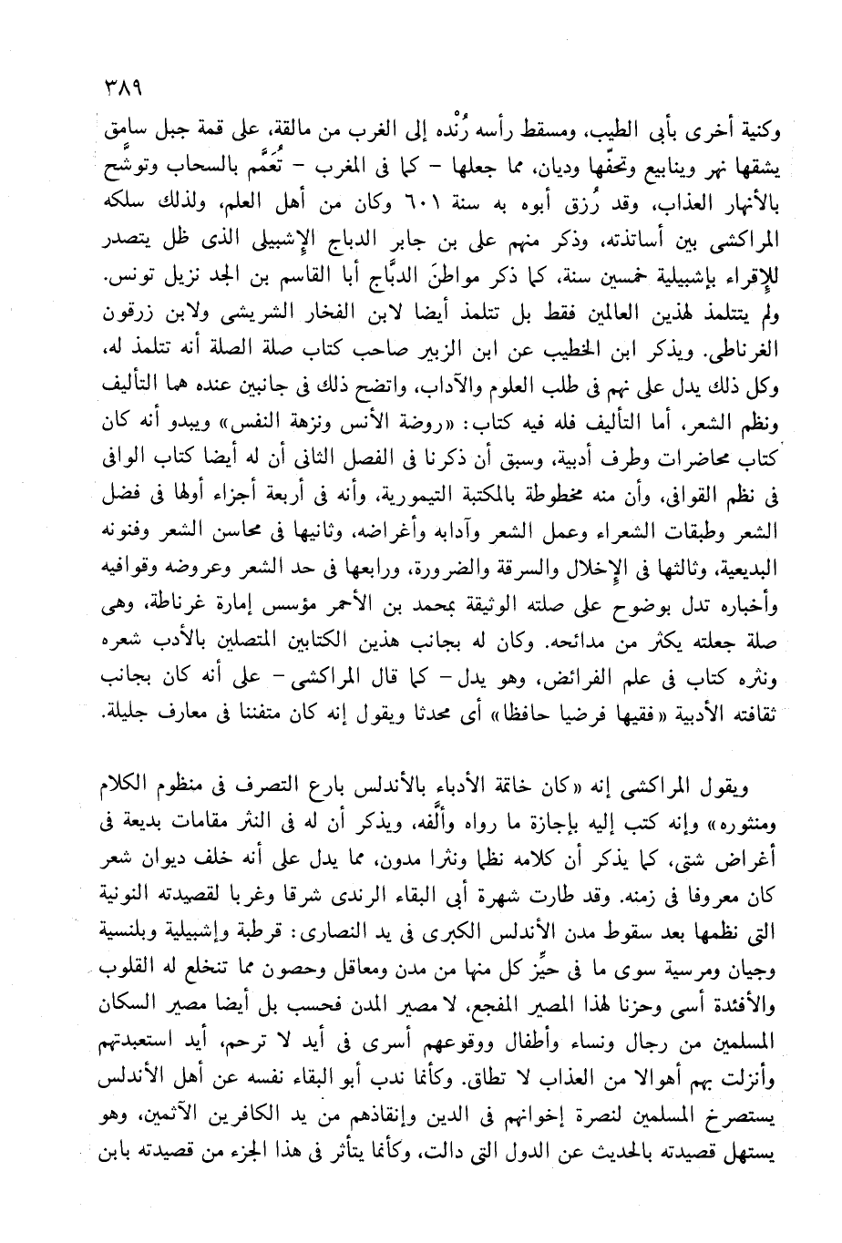 ولم يتتلمذ لهذين العالمين فقط بل تتلمذ أيضا لابن الفخار الشريشى ولابن زرقون الغرناطى. ويذكر ابن الخطيب عن ابن الزبير صاحب كتاب صلة الصلة أنه تتلمذ له، وكل ذلك يدل على نهم فى طلب العلوم والآداب، واتضح ذلك فى جانبين عنده هما التأليف ونظم الشعر، أما التأليف فله فيه كتاب: «روضة الأنس ونزهة النفس» ويبدو أنه كان كتاب محاضرات وطرف أدبية، وسبق أن ذكرنا فى الفصل الثانى أن له أيضا كتاب الوافى فى نظم القوافى، وأن منه مخطوطة بالمكتبة التيمورية، وأنه فى أربعة أجزاء أولها فى فضل الشعر وطبقات الشعراء وعمل الشعر وآدابه وأغراضه، وثانيها فى محاسن الشعر وفنونه البديعية، وثالثها فى الإخلال والسرقة والضرورة، ورابعها فى حد الشعر وعروضه وقوافيه وأخباره تدل بوضوح على صلته الوثيقة بمحمد بن الأحمر مؤسس إمارة غرناطة، وهى صلة جعلته يكثر من مدائحه. وكان له بجانب هذين الكتابين المتصلين بالأدب شعره ونثره كتاب فى علم الفرائض، وهو يدل-كما قال المراكشى-على أنه كان بجانب ثقافته الأدبية «فقيها فرضيا حافظا» أى محدثا ويقول إنه كان متفننا فى معارف جليلة.