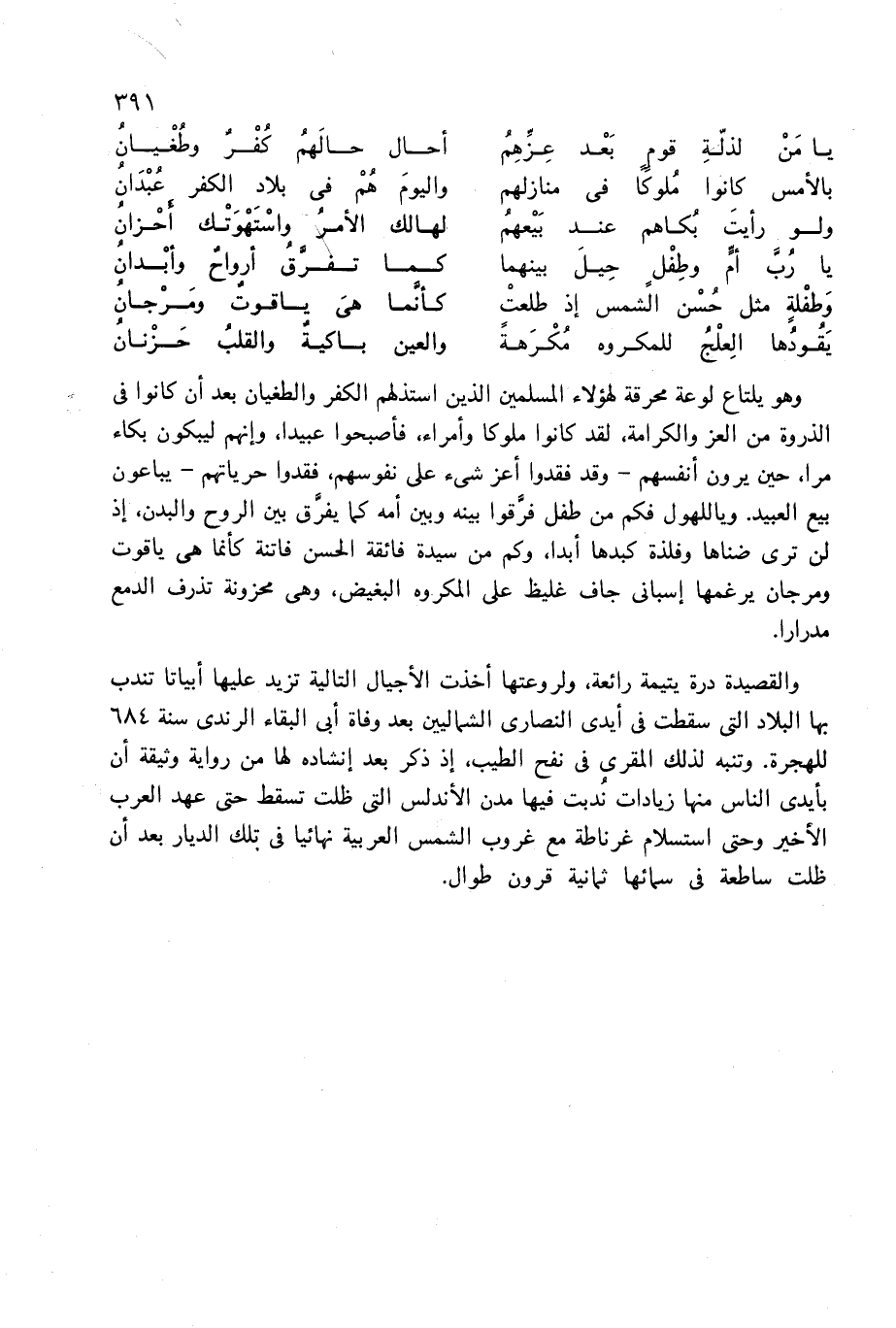 وهو يلتاع لوعة محرقة لهؤلاء المسلمين الذين استذلهم الكفر والطغيان بعد أن كانوا فى الذروة من العز والكرامة، لقد كانوا ملوكا وأمراء، فأصبحوا عبيدا، وإنهم ليبكون بكاء مرا، حين يرون أنفسهم-وقد فقدوا أعز شئ على نفوسهم، فقدوا حرياتهم-يباعون بيع العبيد. ويا للهول فكم من طفل فرّقوا بينه وبين أمه كما يفرّق بين الروح والبدن، إذ لن ترى ضناها وفلذة كبدها أبدا، وكم من سيدة فائقة الحسن فاتنة كأنما هى ياقوت ومرجان يرغمها إسبانى جاف غليظ على المكروه البغيض، وهى محزونة تذرف الدمع مدرارا.