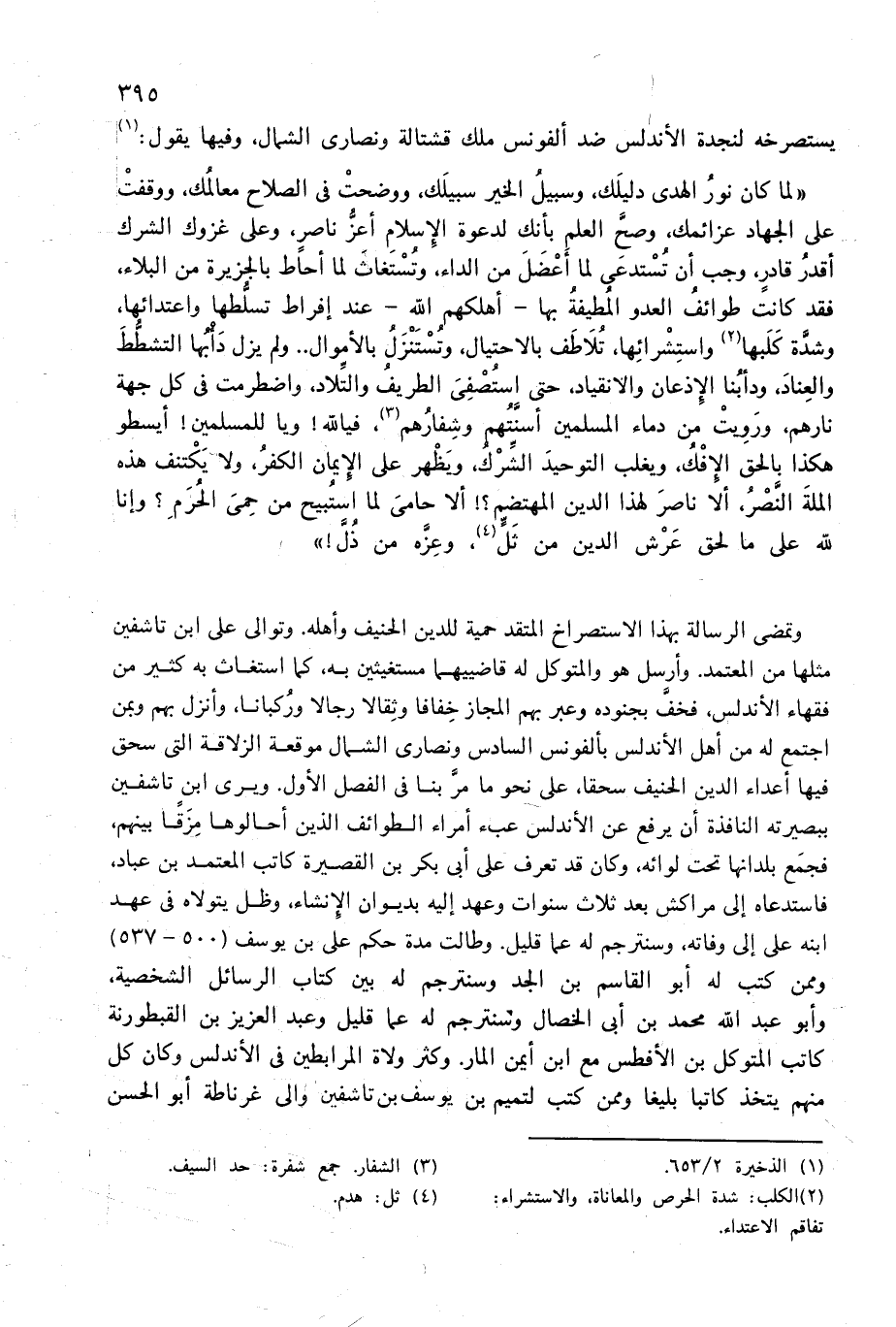 «لما كان نور الهدى دليلك، وسبيل الخير سبيلك، ووضحت فى الصلاح معالمك، ووقفت على الجهاد عزائمك، وصحّ العلم بأنك لدعوة الإسلام أعزّ ناصر، وعلى غزوك الشرك أقدر قادر، وجب أن تستدعى لما أعضل من الداء، وتستغاث لما أحاط بالجزيرة من البلاء، فقد كانت طوائف العدو المطيفة بها-أهلكهم الله-عند إفراط تسلّطها واعتدائها، وشدّة كلبها (¬2) واستشرائها، تلاطف بالاحتيال، وتستنزل بالأموال. . ولم يزل دأبها التشطّط والعناد، ودأبنا الإذعان والانقياد، حتى استصفى الطريف والتّلاد، واضطرمت فى كل جهة نارهم، ورويت من دماء المسلمين أسنّتهم وشفارهم (¬3)، فيالله! ويا للمسلمين! أيسطو هكذا بالحق الإفك، ويغلب التوحيد الشّرك، ويظهر على الإيمان الكفر، ولا يكتنف هذه الملة النّصر، ألا ناصر لهذا الدين المهتضم؟ ! ألا حامى لما استبيح من حمى الحرم؟ وإنا لله على ما لحق عرش الدين من ثلّ (¬4)، وعزّه من ذلّ! »