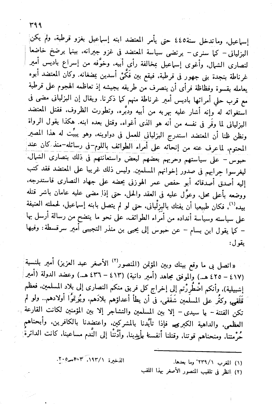إسماعيل، وما تدخل سنة 445 حتى يأمر المعتضد ابنه إسماعيل بغزو قرطبة، ولم يكن البزليانى-كما سنرى-يرتضى سياسة المعتضد فى غزو جيرانه، بينما يرضخ خاضعا لنصارى الشمال، وأغوى إسماعيل بمخالفة رأى أبيه، وخوّفه من إسراع باديس أمير غرناطة بنجدة بنى جهور فى قرطبة، فيقع بين فكّى أسدين يمضغانه. وكان المعتضد أبوه يعامله بقسوة وفظاظة فرأى أن ينصرف من طريقه بجيشه إذ تعاظمه الهجوم على قرطبة مع قرب حلي أمرائها باديس أمير غرناطة منهم كما ذكرنا. ويقال إن البزليانى مضى فى استغوائه له وإنه أشار عليه بهربه من أبيه ودبّره، وتطورت الظروف، فقتل المعتضد البزليانى لما وقر فى نفسه من أنه هو الذى أغواه، وقتل بعده ابنه. هكذا يقول الرواة ونظن ظنا أن المعتضد استدرج البزليانى للعمل فى دواوينه، وهو يبيّت له هذا المصير المحتوم، لما عرف عنه من إنحائه على أمراء الطوائف باللوم-فى رسائله-منذ كان عند حبوس-على سياستهم وحربهم بعضهم لبعض واستعانتهم فى ذلك بنصارى الشمال، ليغرسوا حرابهم فى صدور إخوانهم المسلمين. وليس ذلك غريبا على المعتضد فقد كتب إليه أصدق أصدقائه أبو حفص عمر الهوزنى يحضه على جهاد النصارى فاستدرجه، ووضعه بأعلى محل، وعوّل عليه فى العقد والحل، حتى إذا مضى عليه عامان باشر قتله بيده (¬1)، فكان طبيعيا أن يفتك بالبزليانى، حتى لو لم يتصل بابنه إسماعيل، لحملته العنيفة على سياسته وسياسة أنداده من أمراء الطوائف، على نحو ما يتضح من رسالة أرسل بها -كما يقول ابن بسام-عن حبوس إلى يحيى بن منذر التجيبى أمير سرقسطة: وفيها يقول: