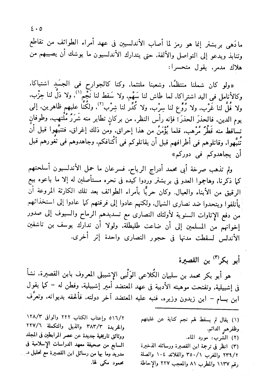 (¬3) انظر فى ترجمة ابن القصيرة ورسائله الذخيرة 2/ 239 والمغرب 1/ 350 والقلائد 104 والصلة رقم 1137 والمطرب 81 والمعجب 227 والإحاطة 2/ 516 وإعتاب الكتاب 222 والوافى 3/ 128 والخريدة 3/ 383 والذيل والتكملة 6/ 227 ووثائق تاريخية جديدة عن عصر المرابطين فى المجلد السابع من صحيفة معهد الدراسات الإسلامية فى مدريد وما بها من رسائل ابن القصيرة مع تحليل د. محمود مكى لها.