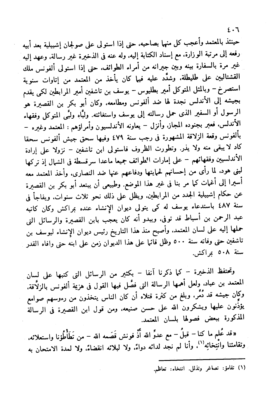 حينئذ بالمعتمد وأعجب كل منهما بصاحبه، حتى إذا استولى على صولجان إشبيلية بعد أبيه رفعه إلى مرتبة الوزارة، مع إسناد الكتابة إليه، وله عنه فى الذخيرة غير رسالة، وعهد إليه غير مرة بالسفارة بينه وبين جيرانه من أمراء الطوائف، حتى إذا استولى ألفونس ملك القشتاليين على طليطلة، وشدّد عليه فيما كان يأخذ من المعتمد من إتاوات سنوية استصرخ-وبالمثل المتوكل أمير بطليوس-يوسف بن تاشفين أمير المرابطين لكى يقدم بجيشه إلى الأندلس نجدة لها ضد ألفونس ومطامعه، وكان أبو بكر بن القصيرة هو الرسول أو السفير الذى حمل رسالته إلى يوسف واستغاثته. ولبّاه ولبّى المتوكل وفقهاء الأندلس، فعبر بجنوده المجاز، وأنزل-يعاونه الأندلسيون وأمراؤهم: المعتمد وغيره- بألفونس وقعة الزلاقة المشهورة فى رجب سنة 479 وفيها سحق جيش ألفونس سحقا كاد لا يبقى منه ولا يذر. وتطورت الظروف فاستولى ابن تاشفين-نزولا على إرادة الأندلسيين وفقهائهم-على إمارات الطوائف جميعا ما عدا سرقسطة فى الشمال إذ تركها لبنى هود، لما رأى من إحسانهم لحمايتها ودفاعهم عنها ضد النصارى، وأخذ المعتمد معه أسيرا إلى أغمات كما مر بنا فى غير هذا الموضع. وطبيعى أن يبتعد أبو بكر بن القصيرة عن حكام إشبيلية الجدد من المرابطين، ويظل على ذلك نحو ثلاث سنوات، ويفاجأ فى سنة 487 باستدعاء يوسف له كى يتولى ديوان الإنشاء عنده بمراكش وكان كاتبه عبد الرحمن بن أسباط قد توفى، ويبدو أنه كان يعجب بابن القصيرة والرسائل التى حملها إليه على لسان المعتمد، وأصبح منذ هذا التاريخ رئيس ديوان الإنشاء ليوسف بن تاشفين حتى وفاته سنة 500 وظل قائما على هذا الديوان زمن على ابنه حتى وافاه القدر سنة 508 بمراكش.