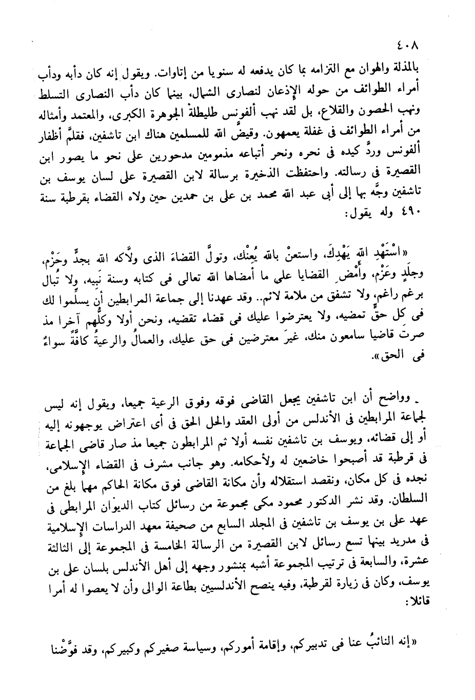 وواضح أن ابن تاشفين يجعل القاضى فوقه وفوق الرعية جميعا، ويقول إنه ليس لجماعة المرابطين فى الأندلس من أولى العقد والحل الحق فى أى اعتراض يوجهونه إليه أو إلى قضائه، ويوسف بن تاشفين نفسه أولا ثم المرابطون جميعا مذ صار قاضى الجماعة فى قرطبة قد أصبحوا خاضعين له ولأحكامه. وهو جانب مشرف فى القضاء الإسلامى، نجده فى كل مكان، ونقصد استقلاله وأن مكانة القاضى فوق مكانة الحاكم مهما بلغ من السلطان. وقد نشر الدكتور محمود مكى مجموعة من رسائل كتاب الديوان المرابطى فى عهد على بن يوسف بن تاشفين فى المجلد السابع من صحيفة معهد الدراسات الإسلامية فى مدريد بينها تسع رسائل لابن القصيرة من الرسالة الخامسة فى المجموعة إلى الثالثة عشرة، والسابعة فى ترتيب المجموعة أشبه بمنشور وجهه إلى أهل الأندلس بلسان على بن يوسف، وكان فى زيارة لقرطبة، وفيه ينصح الأندلسيين بطاعة الوالى وأن لا يعصوا له أمرا قائلا: