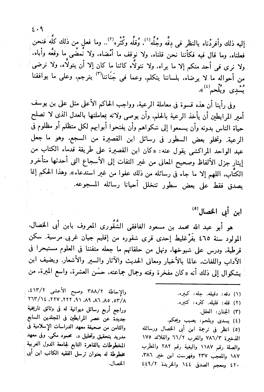 (¬5) انظر فى ترجمة ابن أبى الخصال ورسائله الذخيرة 3/ 786 والمغرب 2/ 66 والقلائد 175 والصلة رقم 1187 والبغية رقم 282 والمطرب 187 والمعجب 237 وفهرست ابن خير 386، 420 ومعجم الصدفى 144 والخريدة 2/ 449 والإحاطة 2/ 388 وصبح الأعشى 2/ 413، 8/ 53، 85، 86، 89، 91، 222، 227، 14/ 263 وراجع أربع رسائل ديوانية له فى وثائق تاريخية جديدة عن عصر المرابطين فى المجلدين السابع والثامن من صحيفة معهد الدراسات الإسلامية فى مدريد بتحقيق وتحليل د. محمود مكى. وفى معهد المخطوطات بالقاهرة التابع لجامعة الدول العربية مخطوطة له بعنوان ترسل الفقيه الكاتب ابن أبى الخصال.