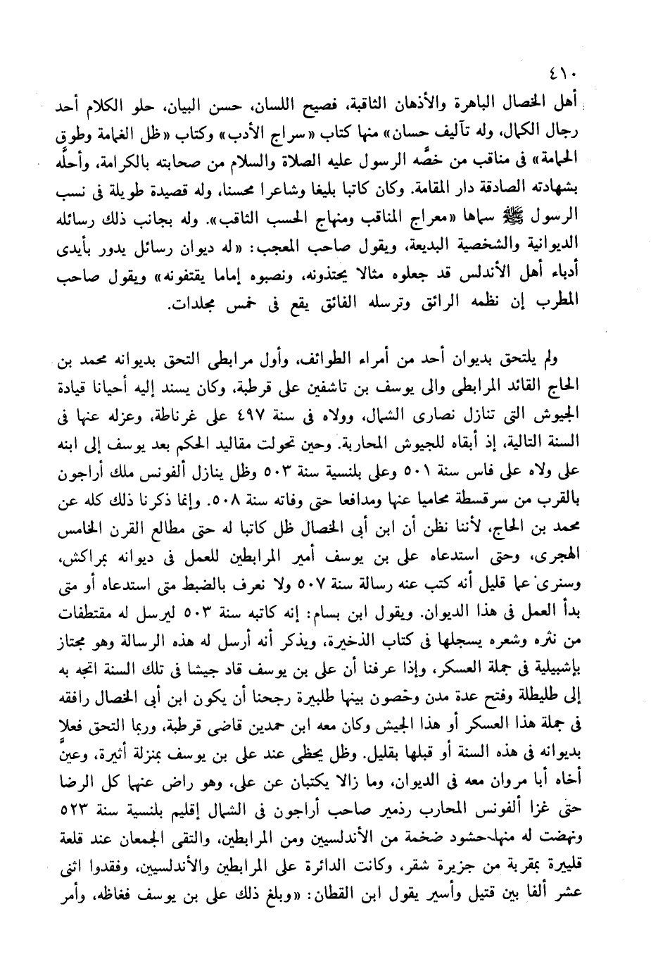 أهل الخصال الباهرة والأذهان الثاقبة، فصيح اللسان، حسن البيان، حلو الكلام أحد رجال الكمال، وله تآليف حسان» منها كتاب «سراج الأدب» وكتاب «ظل الغمامة وطوق الحمامة» فى مناقب من خصّه الرسول عليه الصلاة والسلام من صحابته بالكرامة، وأحلّه بشهادته الصادقة دار المقامة. وكان كاتبا بليغا وشاعرا محسنا، وله قصيدة طويلة فى نسب الرسول صلى الله عليه وسلم سماها «معراج المناقب ومنهاج الحسب الثاقب». وله بجانب ذلك رسائله الديوانية والشخصية البديعة، ويقول صاحب المعجب: «له ديوان رسائل يدور بأيدى أدباء أهل الأندلس قد جعلوه مثالا يحتذونه، ونصبوه إماما يقتفونه» ويقول صاحب المطرب إن نظمه الرائق وترسله الفائق يقع فى خمس مجلدات.
