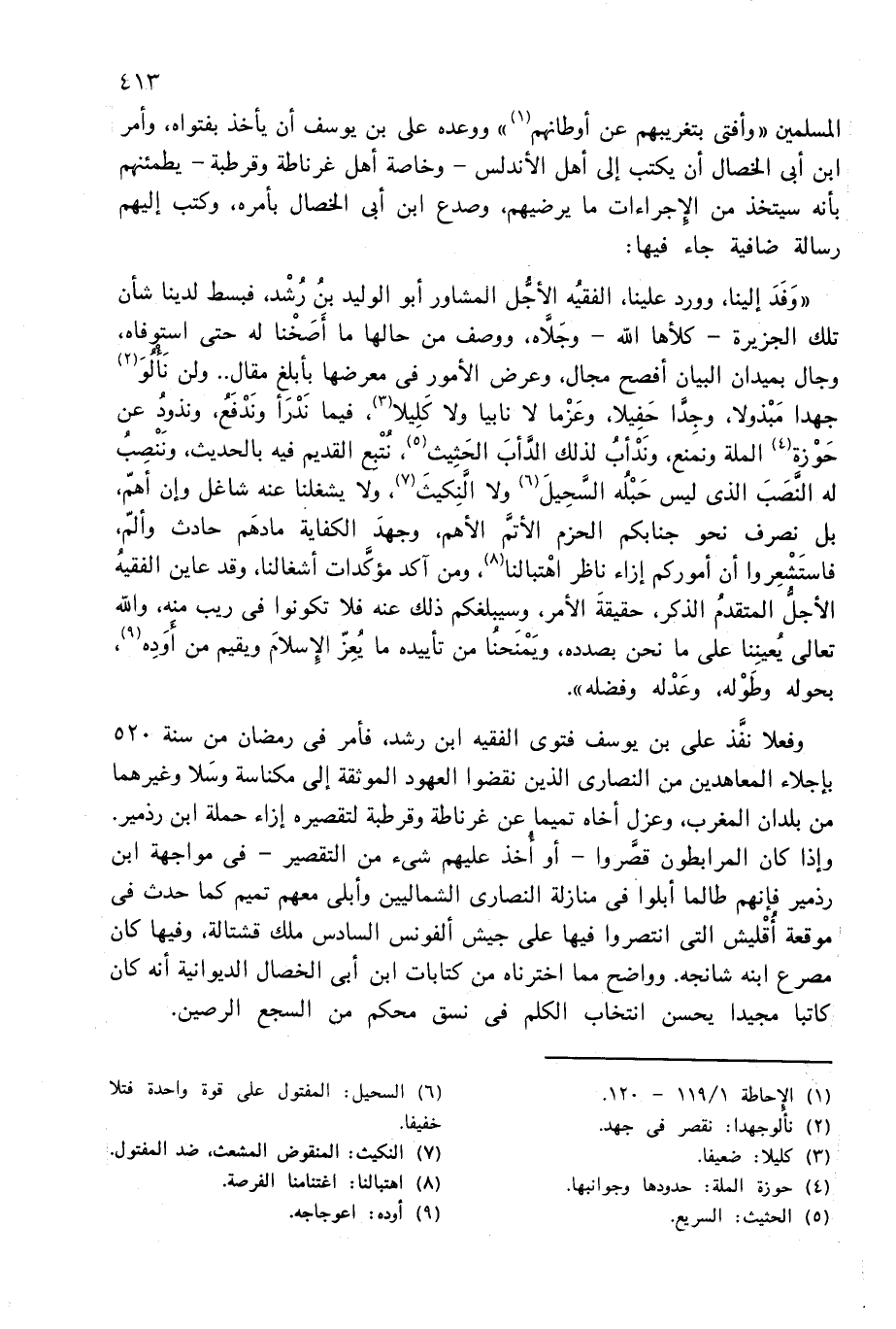 «وفد إلينا، وورد علينا، الفقيه الأجّل المشاور أبو الوليد بن رشد، فبسط لدينا شأن تلك الجزيرة-كلأها الله-وجلاّه، ووصف من حالها ما أصخنا له حتى استوفاه، وجال بميدان البيان أفصح مجال، وعرض الأمور فى معرضها بأبلغ مقال. . ولن نألو (¬2) جهدا مبذولا، وجدّا حفيلا، وعزما لا نابيا ولا كليلا (¬3)، فيما ندرأ وندفع، ونذود عن حوزة (¬4) الملة ونمنع، وندأب لذلك الدّأب الحثيث (¬5)، نتبع القديم فيه بالحديث، وننصب له النّصب الذى ليس حبله السّحيل (¬6) ولا الّنكيث (¬7)، ولا يشغلنا عنه شاغل وإن أهمّ، بل نصرف نحو جنابكم الحزم الأتمّ الأهم، وجهد الكفاية مادهم حادث وألمّ، فاستشعروا أن أموركم إزاء ناظر اهتبالنا (¬8)، ومن آكد مؤكّدات أشغالنا، وقد عاين الفقيه الأجلّ المتقدم الذكر، حقيقة الأمر، وسيبلغكم ذلك عنه فلا تكونوا فى ريب منه، والله تعالى يعيننا على ما نحن بصدده، ويمنحنا من تأييده ما يعزّ الإسلام ويقيم من أوده (¬9)، بحوله وطوله، وعدله وفضله».