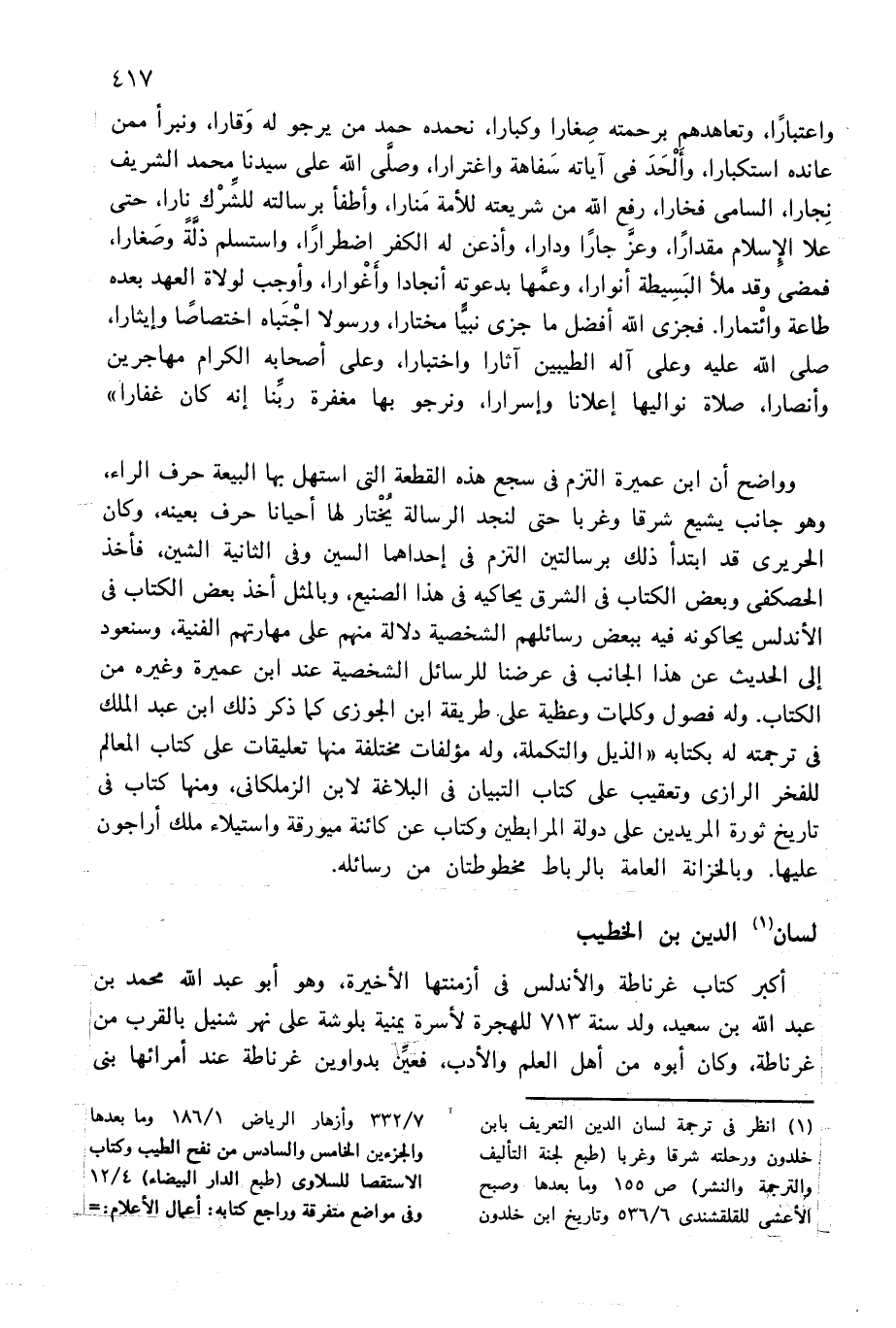 (¬1) انظر فى ترجمة لسان الدين التعريف بابن خلدون ورحلته شرقا وغربا (طبع لجنة التأليف والترجمة والنشر) ص 155 وما بعدها وصبح الأعشى للقلقشندى 6/ 536 وتاريخ ابن خلدون 7/ 332 وأزهار الرياض 1/ 186 وما بعدها والجزءين الخامس والسادس من نفح الطيب وكتاب الاستقصا للسلاوى (طبع الدار البيضاء) 4/ 12 وفى مواضع متفرقة وراجع كتابه: أعمال الأعلام: =