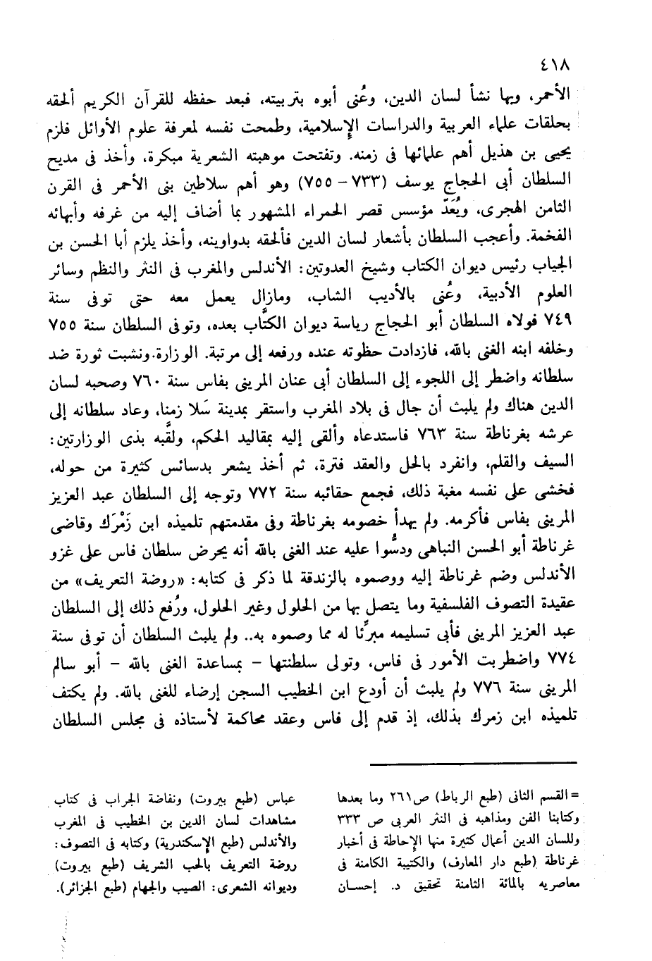 = القسم الثانى (طبع الرباط) ص 261 وما بعدها وكتابنا الفن ومذاهبه فى النثر العربى ص 333 وللسان الدين أعمال كثيرة منها الإحاطة فى أخبار غرناطة (طبع دار المعارف) والكتيبة الكامنة فى معاصريه بالمائة الثامنة تحقيق د. إحسان عباس (طبع بيروت) ونفاضة الجراب فى كتاب مشاهدات لسان الدين بن الخطيب فى المغرب والأندلس (طبع الإسكندرية) وكتابه فى التصوف: روضة التعريف بالحب الشريف (طبع بيروت) وديوانه الشعرى: الصيب والجهام (طبع الجزائر).