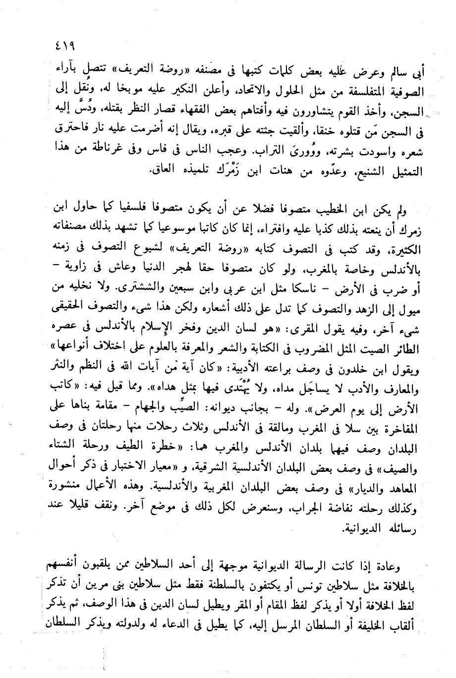 ولم يكن ابن الخطيب متصوفا فضلا عن أن يكون متصوفا فلسفيا كما حاول ابن زمرك أن ينعته بذلك كذبا عليه وافتراء، إنما كان كاتبا موسوعيا كما تشهد بذلك مصنفاته الكثيرة، وقد كتب فى التصوف كتابه «روضة التعريف» لشيوع التصوف فى زمنه بالأندلس وخاصة بالمغرب، ولو كان متصوفا حقا لهجر الدنيا وعاش فى زاوية- أو ضرب فى الأرض-ناسكا مثل ابن عربى وابن سبعين والششترى. ولا نخليه من ميول إلى الزهد والتصوف كما تدل على ذلك أشعاره ولكن هذا شئ والتصوف الحقيقى شئ آخر، وفيه يقول المقرى: «هو لسان الدين وفخر الإسلام بالأندلس فى عصره الطائر الصيت المثل المضروب فى الكتابة والشعر والمعرفة بالعلوم على اختلاف أنواعها» ويقول ابن خلدون فى وصف براعته الأدبية: «كان آية من آيات الله فى النظم والنثر والمعارف والأدب لا يساجل مداه، ولا يهتدى فيها بمثل هداه». ومما قيل فيه: «كاتب الأرض إلى يوم العرض». وله-بجانب ديوانه: الصيّب والجهام-مقامة بناها على المفاخرة بين سلا فى المغرب ومالقة فى الأندلس وثلاث رحلات منها رحلتان فى وصف البلدان وصف فيهما بلدان الأندلس والمغرب هما: «خطرة الطيف ورحلة الشتاء والصيف» فى وصف بعض البلدان الأندلسية الشرقية، و «معيار الاختبار فى ذكر أحوال المعاهد والديار» فى وصف بعض البلدان المغربية والأندلسية. وهذه الأعمال منشورة وكذلك رحلته نفاضة الجراب، وسنعرض لكل ذلك فى موضع آخر. ونقف قليلا عند رسائله الديوانية.