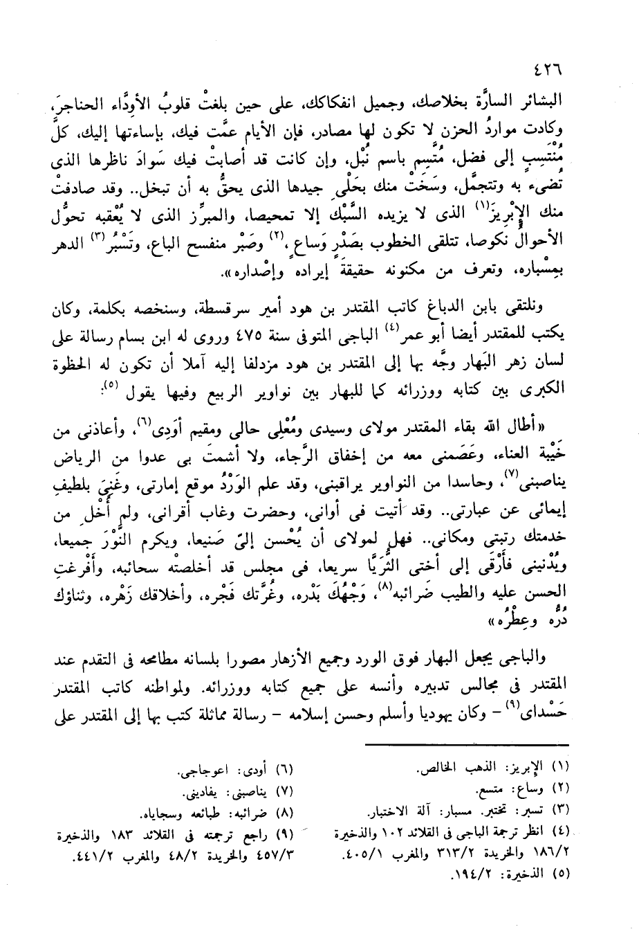 والباجى يجعل البهار فوق الورد وجميع الأزهار مصورا بلسانه مطامحه فى التقدم عند المقتدر فى مجالس تدبيره وأنسه على جميع كتابه ووزرائه. ولمواطنه كاتب المقتدر حسداى (¬9) -وكان يهوديا وأسلم وحسن إسلامه-رسالة مماثلة كتب بها إلى المقتدر على