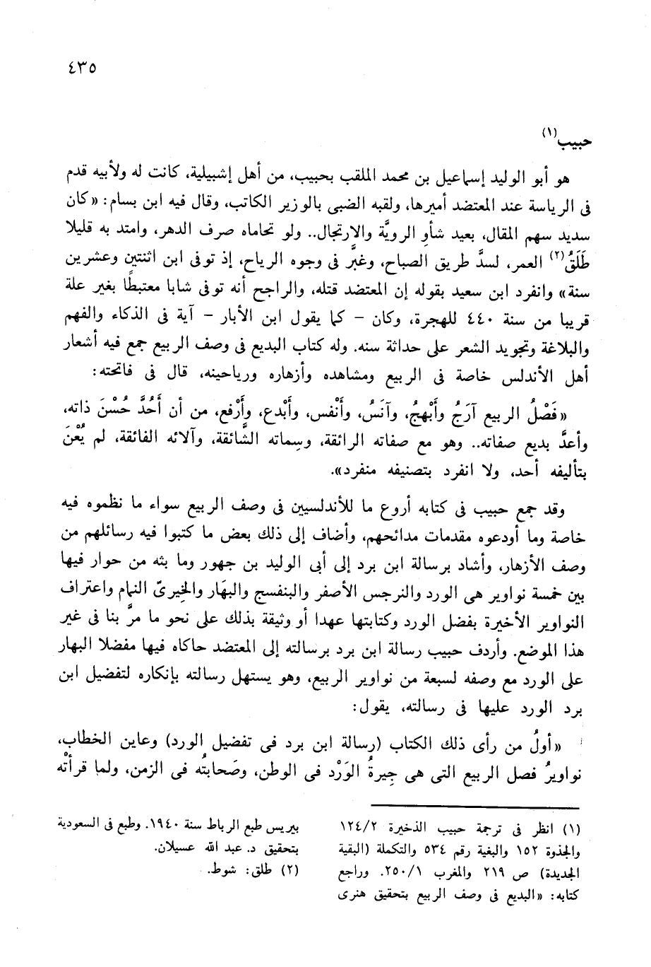 (¬1) انظر فى ترجمة حبيب الذخيرة 2/ 124 والجذوة 152 والبغية رقم 534 والتكملة (البقية الجديدة) ص 219 والمغرب 1/ 250. وراجع كتابه: «البديع فى وصف الربيع بتحقيق هنرى بيريس طبع الرباط سنة 1940. وطبع فى السعودية بتحقيق د. عبد الله عسيلان.