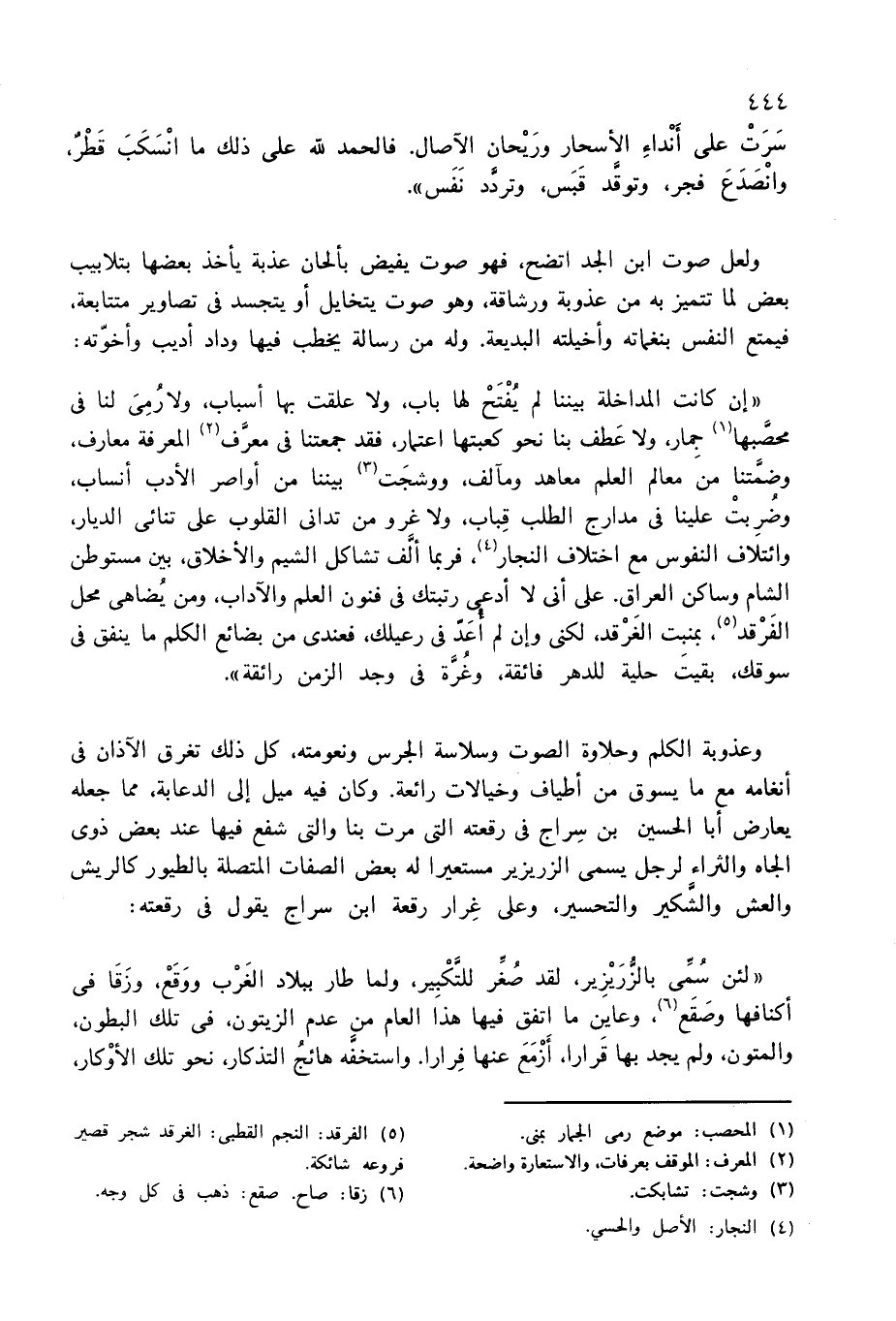 وعذوبة الكلم وحلاوة الصوت وسلاسة الجرس ونعومته، كل ذلك تغرق الآذان فى أنغامه مع ما يسوق من أطياف وخيالات رائعة. وكان فيه ميل إلى الدعابة، مما جعله يعارض أبا الحسين بن سراج فى رقعته التى مرت بنا والتى شفع فيها عند بعض ذوى الجاه والثراء لرجل يسمى الزريزير مستعيرا له بعض الصفات المتصلة بالطيور كالريش والعش والشّكير والتحسير، وعلى غرار رقعة ابن سراج يقول فى رقعته: