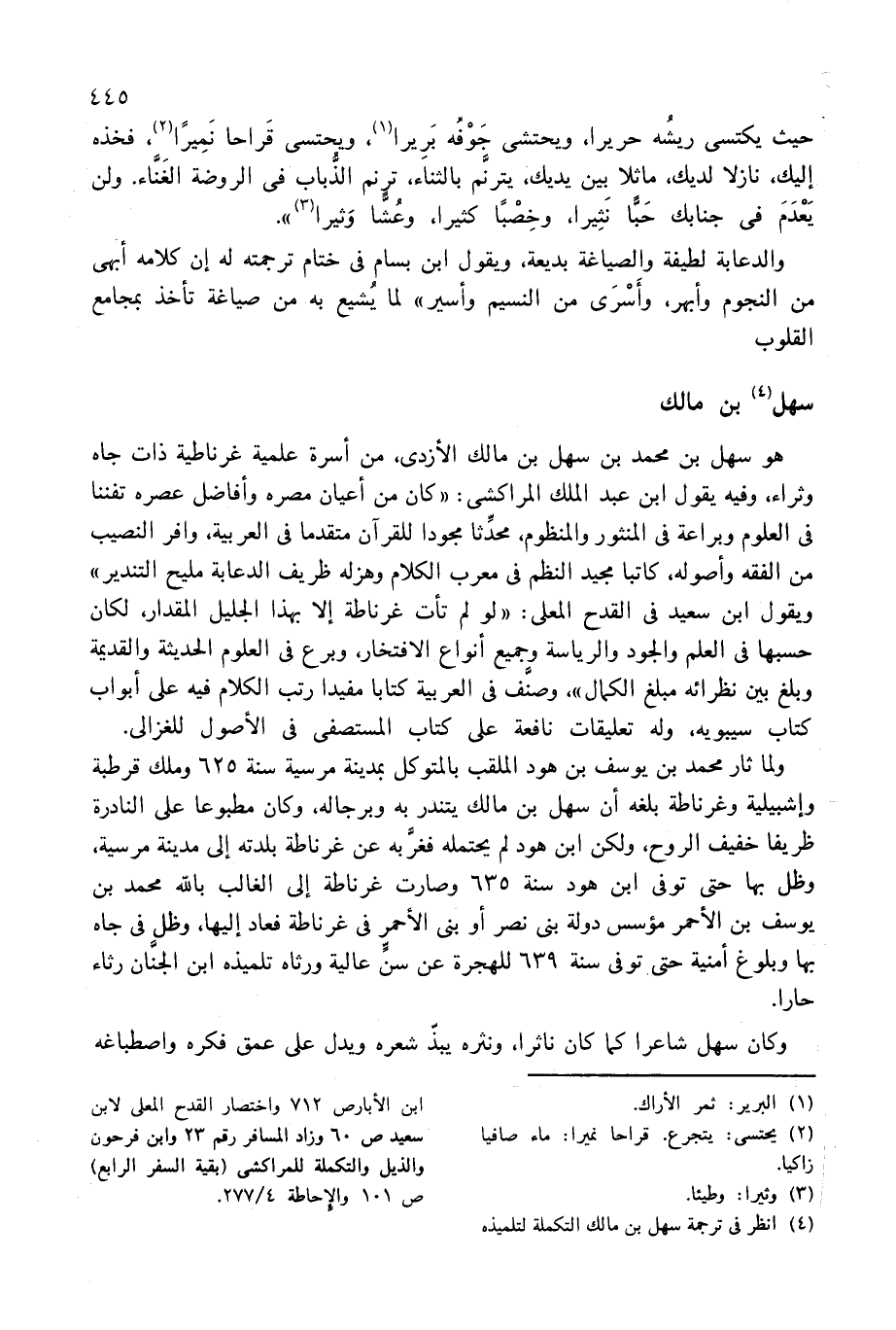 (¬4) انظر فى ترجمة سهل بن مالك التكملة لتلميذه ابن الأبارص 712 واختصار القدح المعلى لابن سعيد ص 60 وزاد المسافر رقم 23 وابن فرحون والذيل والتكملة للمراكشى (بقية السفر الرابع) ص 101 والإحاطة 4/ 277.