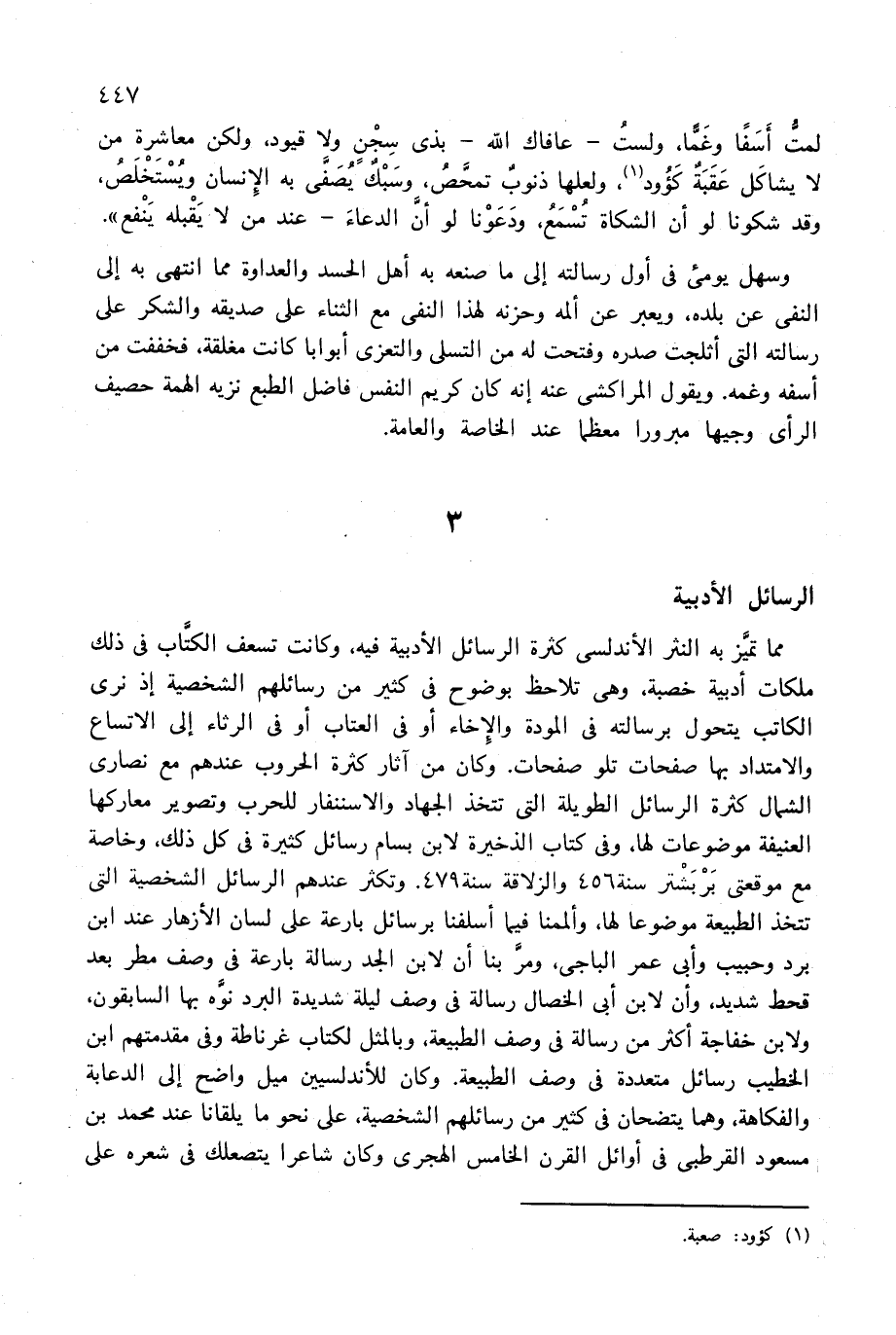لمتّ أسفا وغمّا، ولست-عافاك الله-بذى سجن ولا قيود، ولكن معاشرة من لا يشاكل عقبة كؤود (¬1)، ولعلها ذنوب تمحّص، وسبك يصفّى به الإنسان ويستخلص، وقد شكونا لو أن الشكاة تسمع، ودعونا لو أنّ الدعاء-عند من لا يقبله ينفع».