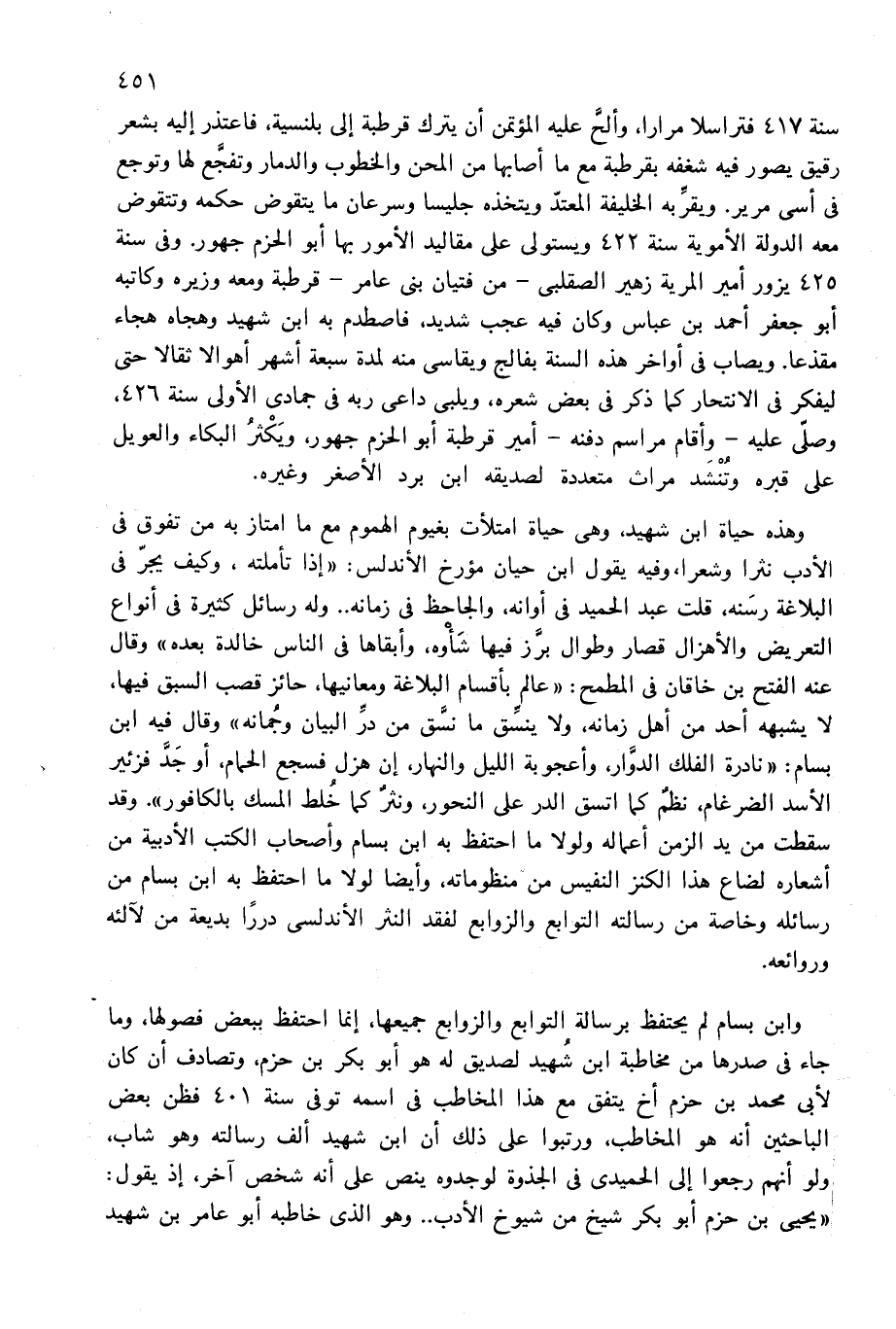 وابن بسام لم يحتفظ برسالة التوابع والزوابع جميعها، إنما احتفظ ببعض فصولها، وما جاء فى صدرها من مخاطبة ابن شهيد لصديق له هو أبو بكر بن حزم، وتصادف أن كان لأبى محمد بن حزم أخ يتفق مع هذا المخاطب فى اسمه توفى سنة 401 فظن بعض الباحثين أنه هو المخاطب، ورتبوا على ذلك أن ابن شهيد ألف رسالته وهو شاب، ولو أنهم رجعوا إلى الحميدى فى الجذوة لوجدوه ينص على أنه شخص آخر، إذ يقول: