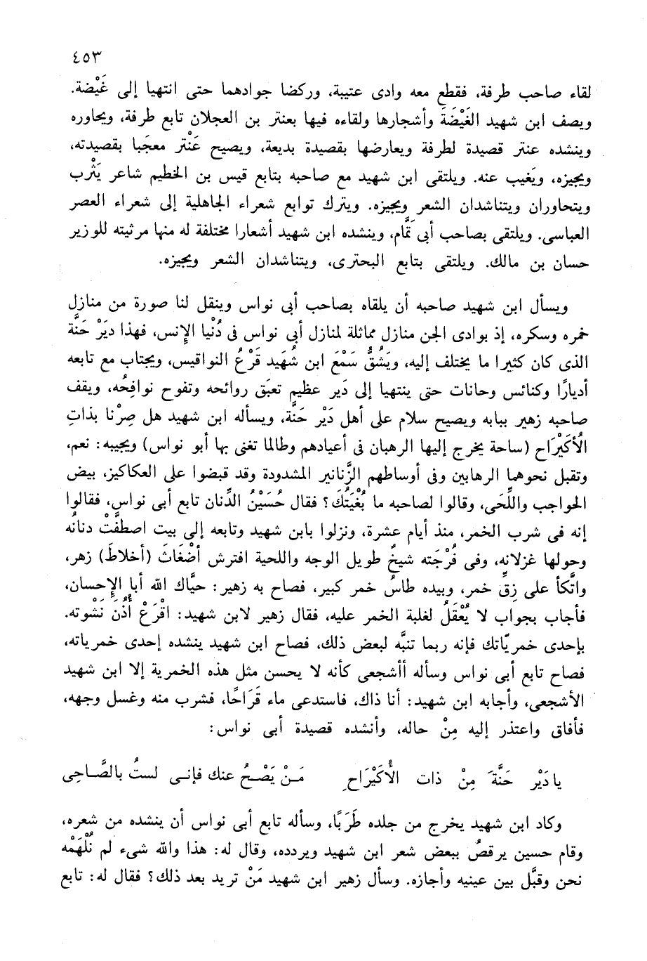 ويسأل ابن شهيد صاحبه أن يلقاه بصاحب أبى نواس وينقل لنا صورة من منازل خمره وسكره، إذ بوادى الجن منازل مماثلة لمنازل أبى نواس فى دنيا الإنس، فهذا دير حنّة الذى كان كثيرا ما يختلف إليه، ويشقّ سمع ابن شهيد قرع النواقيس، ويجتاب مع تابعه أديارا وكنائس وحانات حتى ينتهيا إلى دير عظيم تعبق روائحه وتفوح نوافحه، ويقف صاحبه زهير ببابه ويصيح سلام على أهل دير حنّة، ويسأله ابن شهيد هل صرنا بذات الأكيراح (ساحة يخرج إليها الرهبان فى أعيادهم وطالما تغنى بها أبو نواس) ويجيبه: نعم، وتقبل نحوهما الرهابين وفى أوساطهم الزّنانير المشدودة وقد قبضوا على العكاكيز، بيض الحواجب واللّحى، وقالوا لصاحبه ما بغيتك؟ فقال حسين الدّنان تابع أبى نواس، فقالوا إنه فى شرب الخمر، منذ أيام عشرة، ونزلوا بابن شهيد وتابعه إلى بيت اصطفّت دنانه وحولها غزلانه، وفى فرجته شيخ طويل الوجه واللحية افترش أضغاث (أخلاط) زهر، واتّكأ على زقّ خمر، وبيده طاس خمر كبير، فصاح به زهير: حيّاك الله أبا الإحسان، فأجاب بجواب لا يعقل لغلبة الخمر عليه، فقال زهير لابن شهيد: اقرع أذن نشوته.